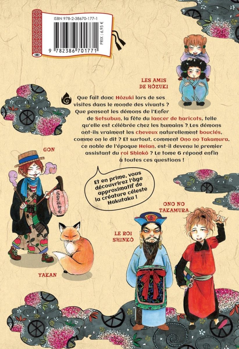 Que fait donc Hôzuki lors de ses visites dans le monde des vivants ? Que pensent les démons de l’Enfer de Setsubun, la fête du lancer de haricots, telle qu’elle est célébrée chez les humains ? L es démons ont-ils vraiment les cheveux naturellement bouclés, comme on le dit ? E t surtout, comment Ono no Takamura, ce noble de l’époque Heian, est-il devenu le premier assistant du roi Shinkô ? Le tome 6 répond enfin à toutes ces questions !
