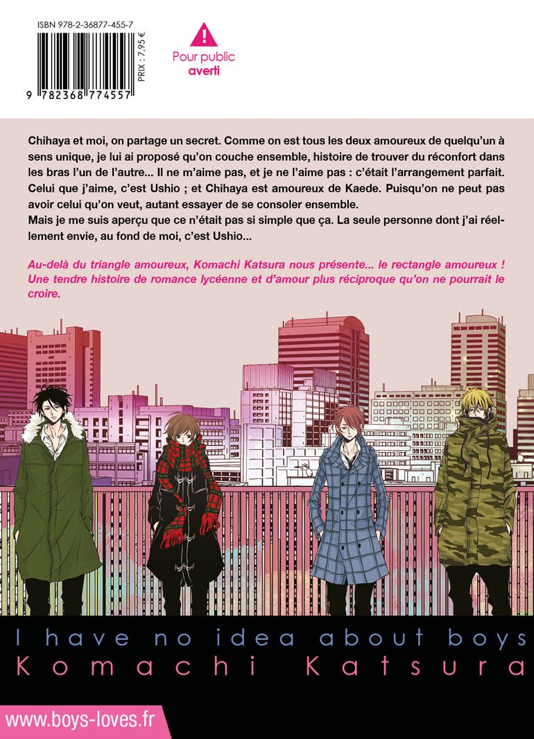 Chihaya et moi, on partage un secret. Comme on est tous les deux amoureux de quelqu’un à sens unique, je lui ai proposé qu’on couche ensemble, histoire de trouver du réconfort dans les bras l’un de l’autre... Il ne m’aime pas, et je ne l’aime pas : c’était l’arrangement parfait. Celui que j’aime, c’est Ushio ; et Chihaya est amoureux de Kaede. Puisqu’on ne peut pas avoir celui qu’on veut, autant essayer de se consoler ensemble.Mais je me suis aperçu que ce n’était pas si simple que ça. La seule personne dont j’ai réellement envie, au fond de moi, c’est Ushio...Au-delà du triangle amoureux, Komachi Katsura nous présente... le rectangle amoureux ! Une tendre histoire de romance lycéenne et d’amour plus réciproque qu’on ne pourrait le croire.