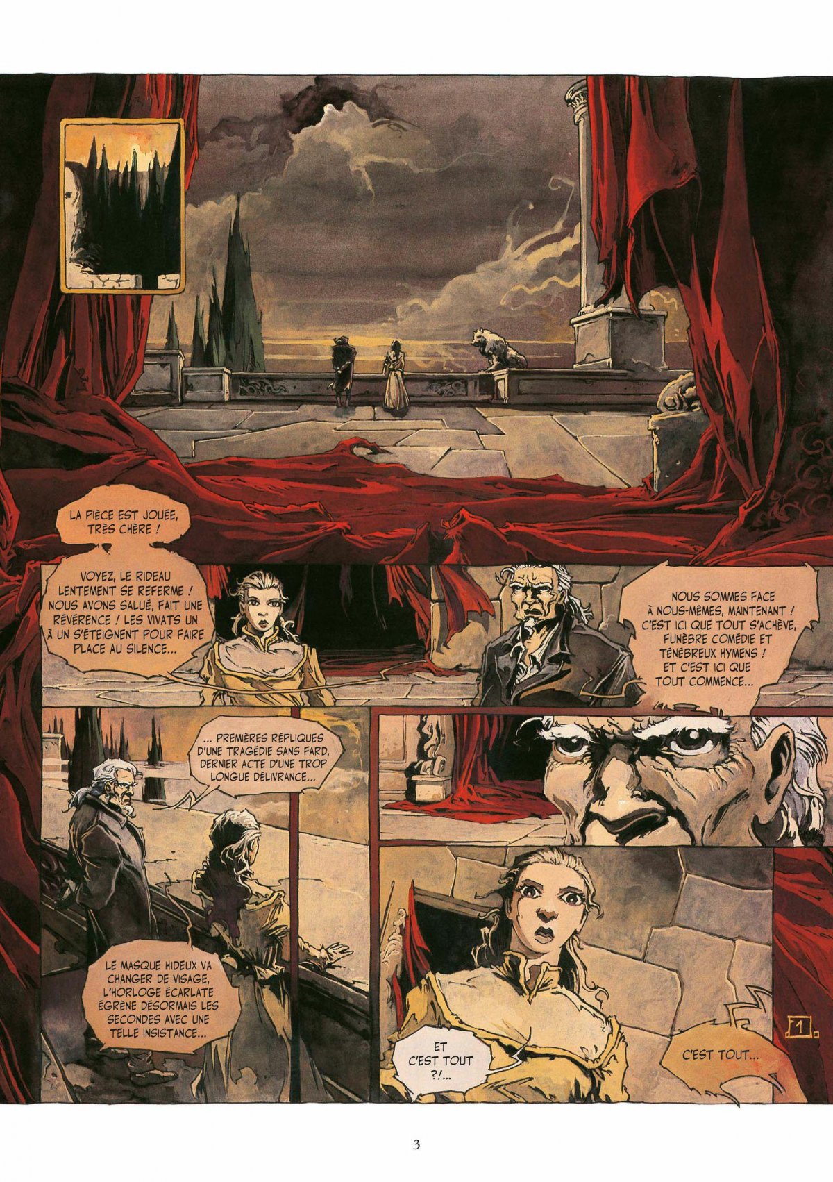 La pièce est jouée ! . Avec ce cinquième tome s’achève la série de I’Ile des Morts, devenue l’une des BD-cultes des années 90 pour tous les passionnés de fantastique pur et dur, pour tous les amoureux d’épouvante à la Jean Ray, Hogson, Owen, Machen, ou encore Lovecraft. Nous voici à Venise, dans " cette Venise ombreuse qui est la nôtre ", pour un dernier acte tragique. Mais avant que le rideau se referme, tandis que chaque acteur à son tour revient sur le devant de la scène, l’Ile des Morts et sa ténébreuse forteresse nous livrent leurs derniers secrets. Sorel et Mosdi, qui ont su ménager le suspense, nous offrent enfin les clés de l’une des plus noires et angoissantes histoires qu’il nous ait été donné de lire depuis longtemps !