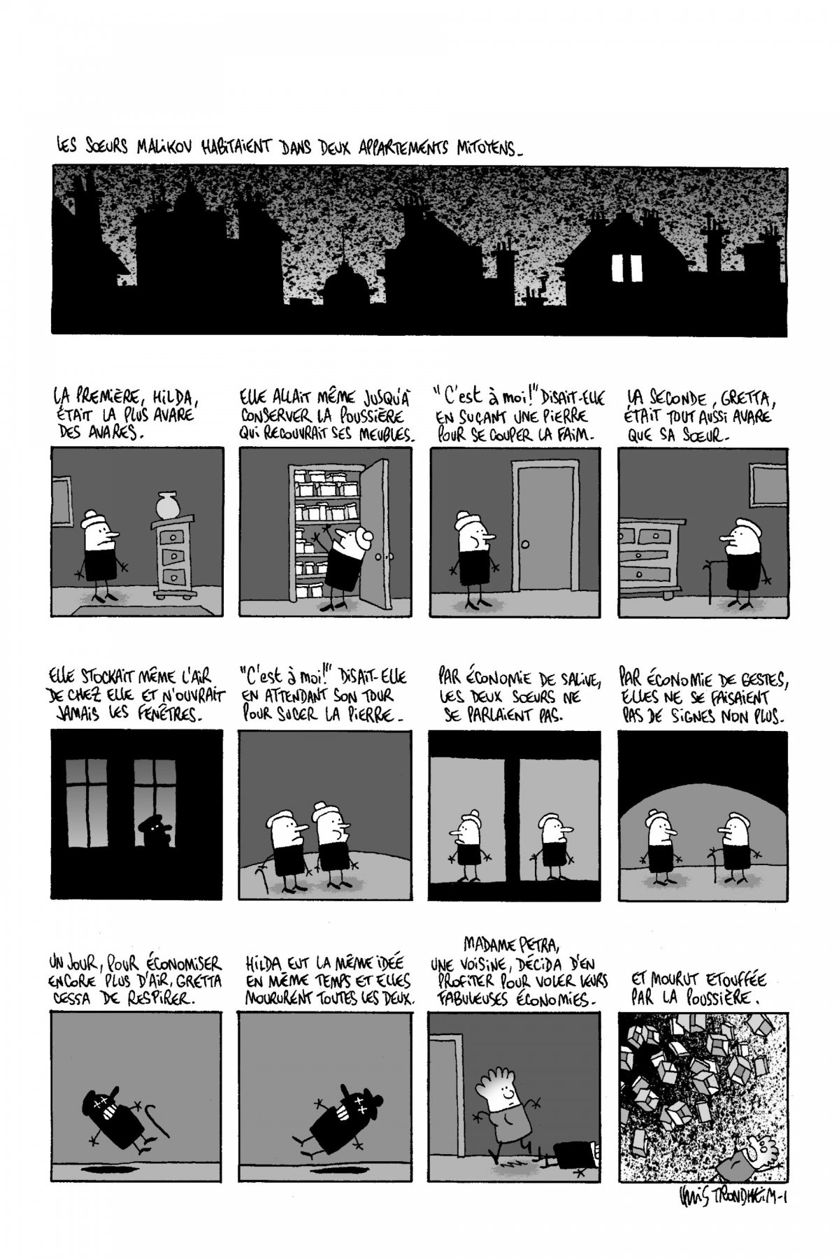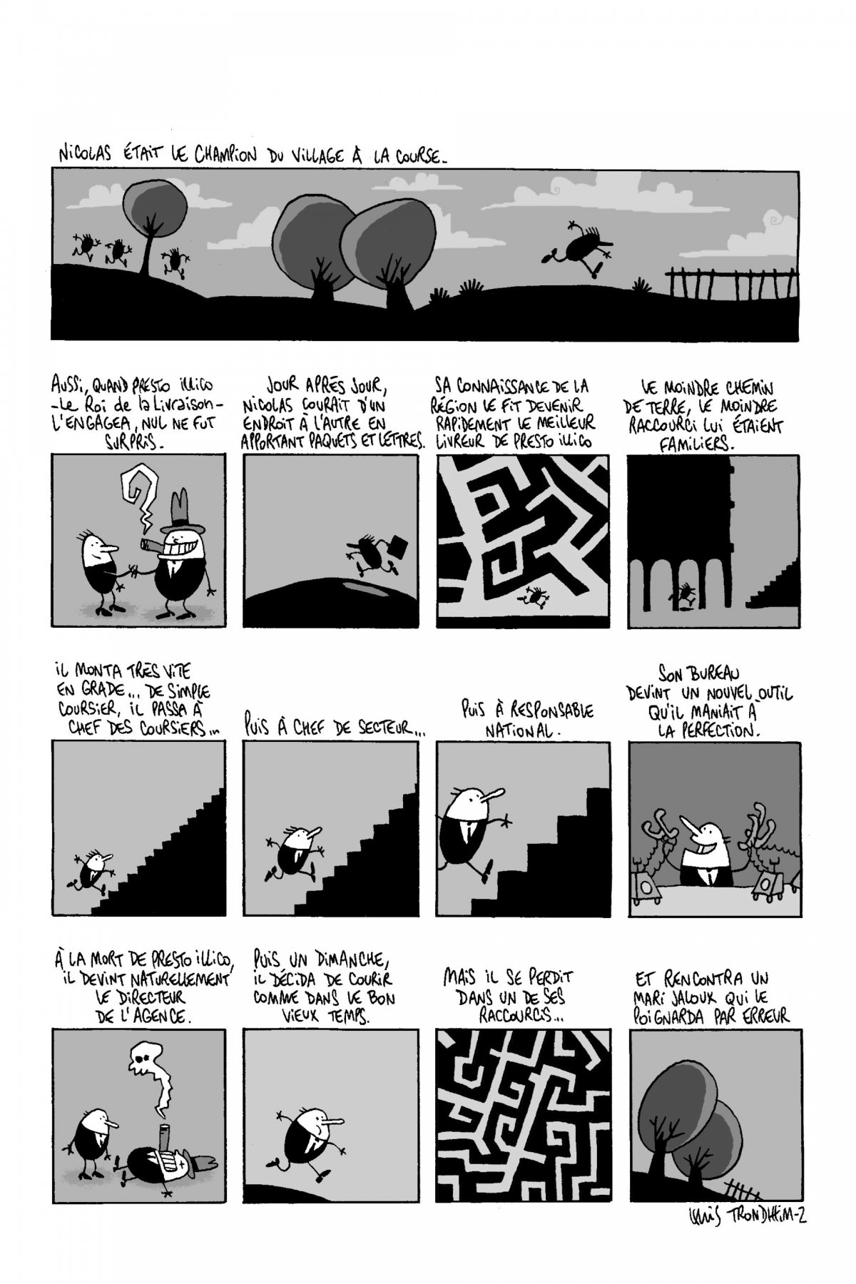 Hommes et femmes patates, poussière, insectes, étoiles, mouchoir, tilleul et extra-terrestres ... Lewis Tronheim, en courtes fables, explose d’humour et de talent. Il y règle ses comptes avec les vaniteux en les ensevelissant dans des mines, sous des tonnes de poussière (conservée par avarice !) ou sous un troupeau d’éléphants ! On est donc loin du conte et de sa morale. A moins que la morale trondheimienne ne soit à ce point galvaudée qu’elle fasse la part belle au meurtre et aux histoires qui finissent mal en général