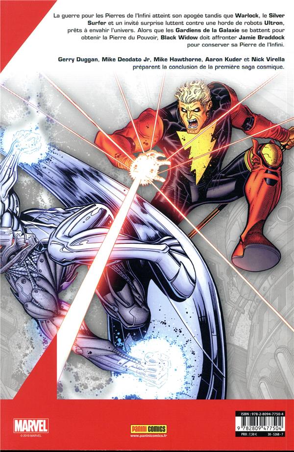La guerre continue alors qu’Adam Warlock doit affronter Ultron pour sauver le Silver Surfer. Pendant ce temps, les Gardiens de la Galaxie affrontent les Chitauri et la Fraternité des Raptors afin de récupérer une Pierre de l’Infini. Au sommaire également, une histoire spéciale consacrée à une détentrice de l’un des joyaux… Black Widow ! Par Duggan, Kuder, Hawthorne, Deodato, Virella et Schoonover. (Contient les épisodes US Infinity Countdown 3-5, Infinity Countdown : Black Widow 1, inédits)