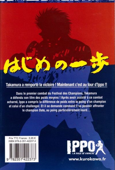 Takamura a remporté la victoire ! Maintenant c’est le tour d’Ippo !! Dans le premier combat du Festival des Champions, Takamura a défendu son titre des poids moyens ! Après avoir assisté à ce combat acharné, Ippo a compris la différence de poids entre le poing d’un champion et celui d’un challenger. Et il se demande comment il va pouvoir affronter le Champion Date, au poing particulièrement lourd...