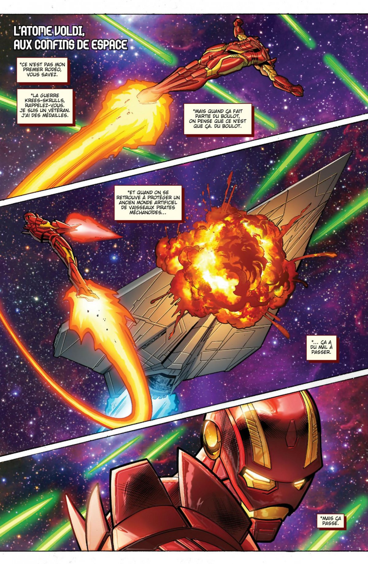 Iron Man part pour l’espace ! Mais son voyage risque de mal tourner puisque le célèbre Avenger se retrouve accusé d’un crime. Une aventure étroitement liée aux événements d’Avengers vs X-Men et durant laquelle Tony Stark se mesure au mercenaire Tête de Mort. Puis, le début d’une grande saga qui lève le voile sur les véritables origines d’Iron Man.