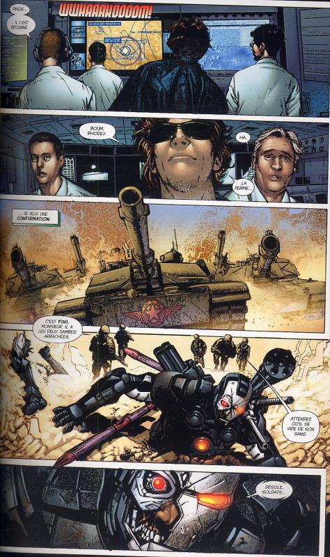 James Rhodes fait son entrée dans l’univers Martel en 1979 dans les pages d’Iron Man, sous le crayon des artistes phare de cette série, David Midrelinie et Bob Layton. Gràce à un stratagème de rétro-continuité, Michelinie `fait apparaître Rhodes à l’époque des débuts d’Iron Man et nous révèle qu’il était alors pilote d’hélicoptère dans les Marines et qu’il a ramené Tony Stark aux Etats-Unis quand ce dernier errait dans la jungle, harnaché de sa toute première armure. Rhodes devient très vite son plus proche et fidèle ami. Il ira jusqu’à le remplacer provisoirement sous la cuirasse d’Iron Man. Et lorsque la Terre entière croira Stark mort, il prendra même les rênes de Stark Industries, selon la volonté de son ami " défunt ". Mais leur relation va se détériorer quand Rhodes découvre que Tony est toujours vivant et qu’il a menti à tout le monde, y compris à lui. C’est d’ailleurs à cette époque que notre homme endosse pour la première fois l’armure de War Machine, que Stark a conçue comme une version plus "militarisée" que celle dIron Man, et équipée d’un arsenal de guerre très lourd. Le héros traverse des hauts et des bas, vit quelques péripéties et changements avant de devenir l’un des instructeurs du Camp Hammond de l’Initiative, un groupe que Stark a réuni a l’issue de la guerre civile. Au début de l’invasion skrull, Rhodes reprend du service sous la cuirasse de War Machine (MARVEL MONSTER : SECRET INVASION 2), mais on apprend qu’une partie de son corps a été reconstituée mécaniquement. On peut donc le considérer désormais comme un cyborg à part entière. Il défend la Terre contre les envahisseurs aliens et établit sa base à bord d’un satellite de Stark en orbite autour de la planète, en compagnie de Suzi Endo, connue jadis sous le nom de Cybermancienne. Aujourd’hui, les États-Unis vivent sous le " règne obscur " de Norman Osbom et James "Rhodey" Rhodes est prêt à se lancer dans de nouvelles aventures sous l’armure de War Machine.