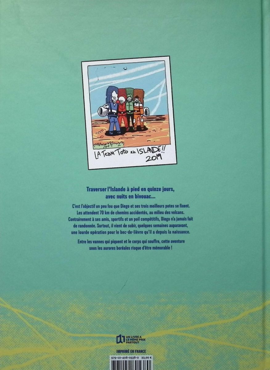 Traverser l’Islande à pied en deux semaines et dormir en bivouac. C’est l’objectif un peu fou que Diego et ses trois meilleurs potes se fixent. Les attendent 70 km de chemins accidentés, au milieu des volcans, dans une nature aussi spectaculaire qu’hostile où seules les formes de vie les plus coriaces ont pu se nicher. Contrairement à ses amis, sportifs parfois plus compétitifs que bienveillants, Diego n’a jamais fait de randonnée. Surtout, il vient de subir, quelques semaines auparavant, une lourde opération pour son bec de lièvre qu’il a depuis la naissance. Le jeune homme relèvera-t-il les défis que lui réserve cette aventure sous les aurores boréales ?
