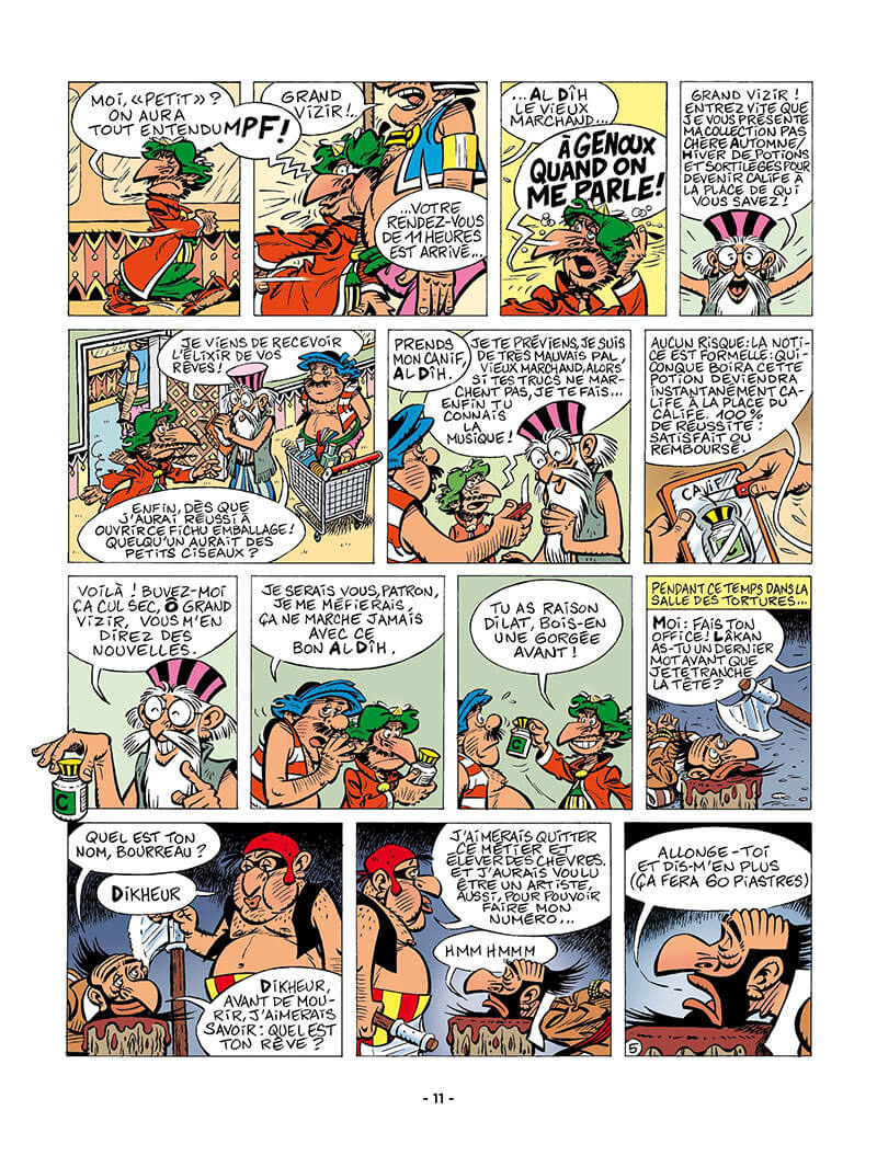 Un mage qui exauce vos rêves en vous écoutant les raconter, une chèvre coiffée qui communique, un redoutable guerrier attentif à la cuisson de ses madeleines, un chauffeur de tapis volant qui se plaint de la circulation, une princesse belle comme la beauté et toujours Haroun El Poussah le paisible calife, Dilat Larath le fidèle homme de main et bien sûr Iznogoud dont l’ambition loin de se tarir, se nourrit de l’air du temps...