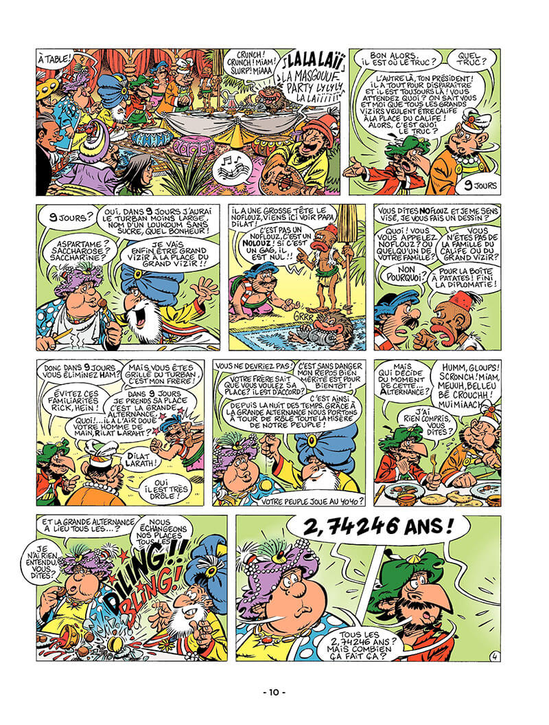 Toutes les 1001 nuits c’est la Grande Alternance. Le calife devient vizir et vice et versa. Il reste 9 jours à Iznogoud avant la passation des turbans. Le bon calife Haroun El Poussah attend lui aussi ce grand jour afin de partir en vacances. Mais pour devenir calife, il faut remplir deux conditions : avoir déjà été calife d’un royaume…et être dans l’enceinte du palais le jour J. Iznogoud a 9 jours pour conquérir un nouveau territoire. Après maintes péripéties il finit par annexer la poche de Larath. Le soleil est au zénith lorsqu’ Iznogoud s’apprête à poser sa babouche dans l’enceinte du palais…fidèle à sa réputation, il va droit à l’échec. Et c’est Dilat Larath qui devient calife de la poche de Larath.