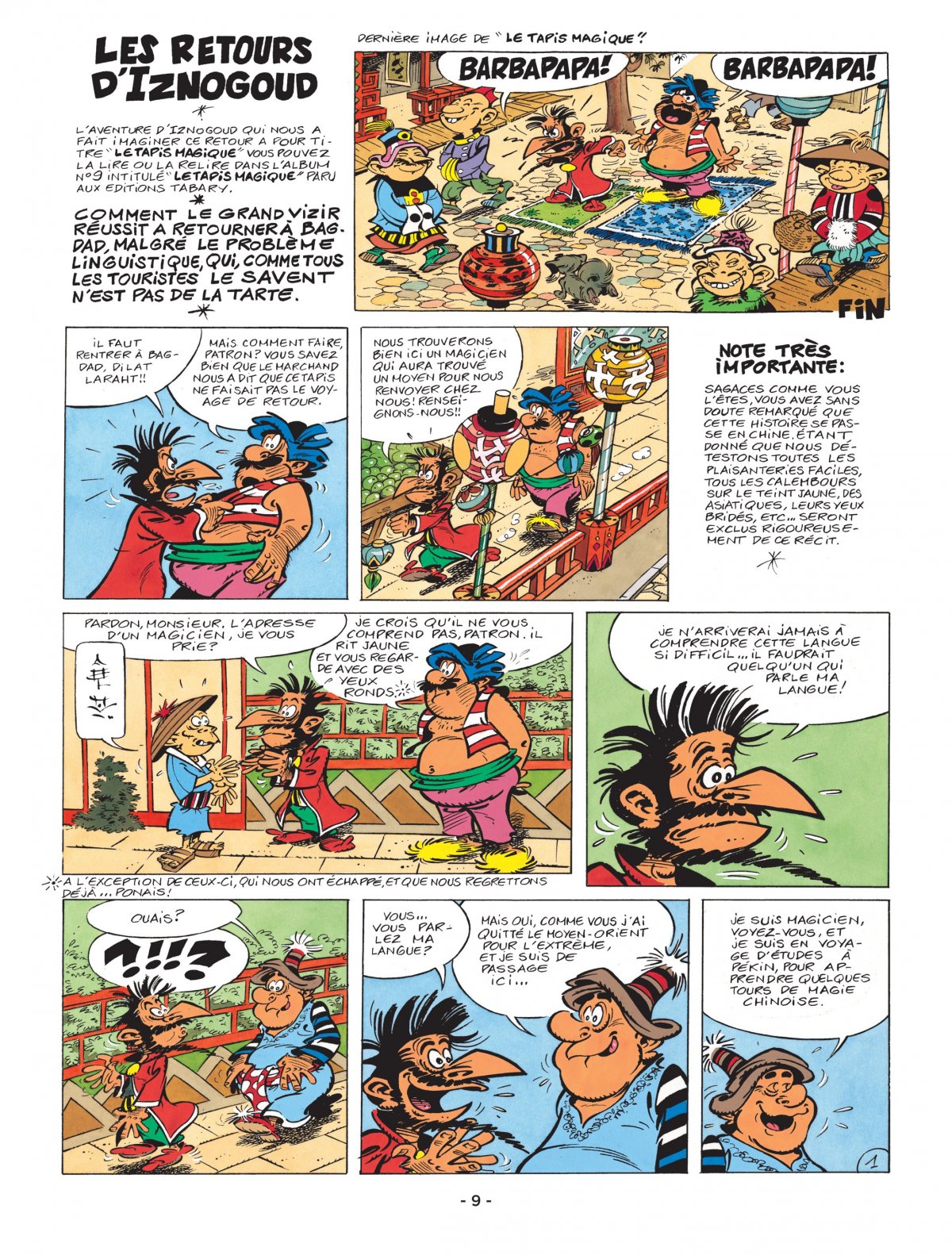 Les retours d’Iznogoud sont de courtes séquences en deux planches qui forment un épilogue comique de certaines des histoires. René Goscinny présentait ainsi cette nouvelle rubrique dans le magazine Record où paraissaient les histoires : « Nos lecteurs ont remarqué qu’à la fin de chaque récit des aventures du bon calife Haroun El Poussah, il arrivait à l’ignoble, immonde et infâme grand vizir Iznogoud des tas de choses désagréables. Rappelez-vous : il a été enfermé dans un cachot, perdu dans un labyrinthe, enrhumé, mis en cage, rendu invisible, pris dans un piège à tigre (avec un tigre), miniaturisé, vendu comme esclave... Et cependant, à chaque nouvelle histoire, notre lecteur retrouve Iznogoud, toujours aussi immonde et infâme. Et notre lecteur se demande : comment fait-il ? Par conséquent nous avons décidé de vous raconter les retours d’Iznogoud.