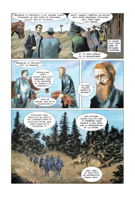 Après plusieurs jours passés dans la forêt avec le président des États-Unis, John Muir parvient à convaincre ce dernier de l’importance de prendre des mesures pour protéger la nature sauvage. Ainsi sont créés les premiers parcs nationaux, dont le célèbre Yosemite. C’est le fil conducteur du scénario de Clément Baloup, qui nous mène à travers les grands chemins qu’emprunta ce pionnier de l’écologie aux allures de prophète.