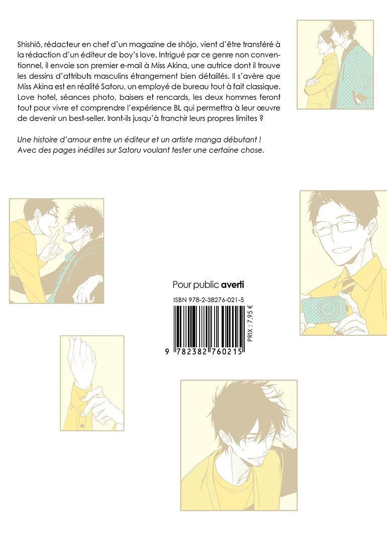 Shishiô, rédacteur en chef d’un magazine de shôjo, vient d’être transféré à la rédaction d’un éditeur de boy’s love. Intrigué par ce genre non conventionnel, il envoie son premier e-mail à Miss Akina, une autrice dont il trouve les dessins d’attributs masculins étrangement bien détaillés. Il s’avère que Miss Akina est en réalité Satoru, un employé de bureau tout à fait classique. Love hotel, séances photo, baisers et rencards, les deux hommes feront tout pour vivre et comprendre l’expérience BL qui permettra à leur oeuvre de devenir un best-seller. Iront-ils jusqu’à franchir leurs propres limites ?