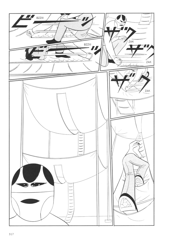 Par une brèche dans un mur, une foule de plusieurs centaines de personnes pénètre dans le « jardin » et découvre peu à peu ce vaste territoire interdit constitué d’une succession de paysages artificiels animés de mouvements automatisés. Le « jardin » est un décor désert, habité uniquement de dispositifs mécaniques, de cliquetis, de chocs et de grincements, un lieu sans orientation ni logique qui paraît généré au fur et à mesure de la curiosité qu’il suscite. Un lieu probablement sans fin, voué à l’inouï, à l’extraordinaire, à l’invention. Jardin peut paraître déroutant : l’aspect non finito du dessin d’abord, un dessin volontairement moins maîtrisé, moins parfait que dans les précédents ouvrages de Yokoyama. Ici, il travaille vite et sa vivacité d’exécution est perceptible, le dynamisme du dessin participe de l’écriture et du déroulement du récit. Et puis, les dialogues : pur redoublement des paysages et des actions, pure tautologie du dessin, les dialogues les plus plats, probablement, de l’histoire du neuvième art. Et pourtant, page après page, ces dialogues s’imposent comme le guide déroutant des paysages sans repères, hors lieux. Mécaniques eux-mêmes, d’une fonctionnalité transparente, ils sont le négatif, la doublure hypnotique des artifices qui composent le jardin. Pour dire vite et vrai, on dira désormais qu’avec Yokoyama, le XXIe siècle a trouvé son Raymond Roussel. Jardin est son Locus solus.