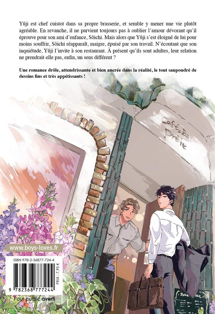 Yûji est chef cuistot dans sa propre brasserie, et semble y mener une vie plutôt agréable. En revanche, il ne parvient toujours pas à oublier l’amour dévorant qu’il éprouve pour son ami d’enfance, Sôichi.Mais alors que Yûji s’est éloigné de lui pour moins souffrir, Sôichi réapparaît, maigre, épuisé par son travail. N’écoutant que son inquiétude, Yûji l’invite à son restaurant. À présent qu’ils sont adultes, leur relation ne prendrait-elle pas, enfin, un sens différent ?Une romance drôle, attendrissante et bien encrée dans la réalité, le tout saupoudré de dessins fins et très appétissants !
