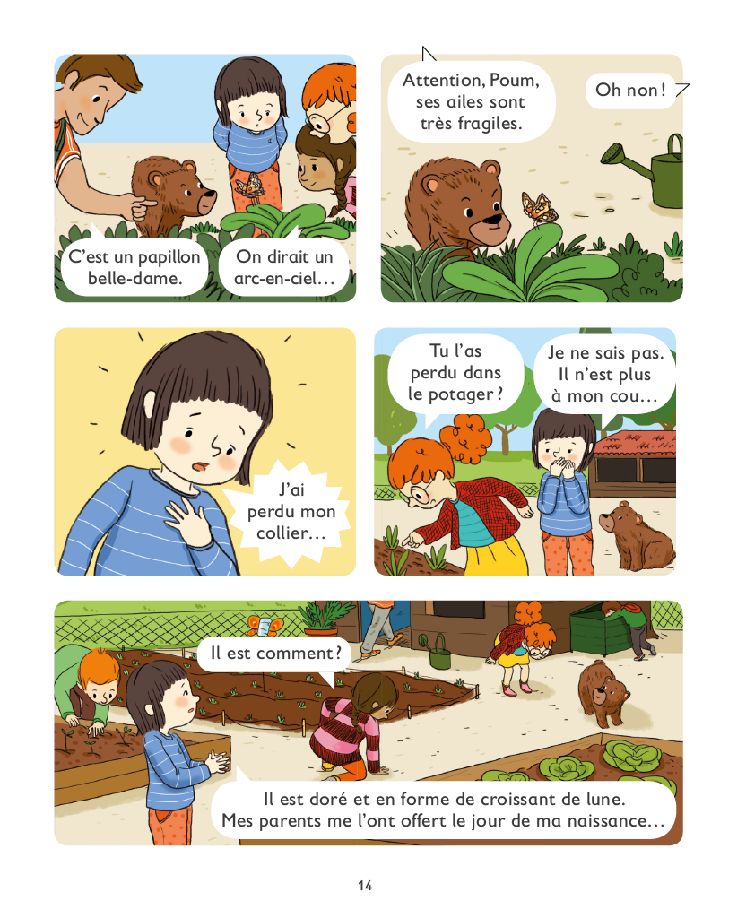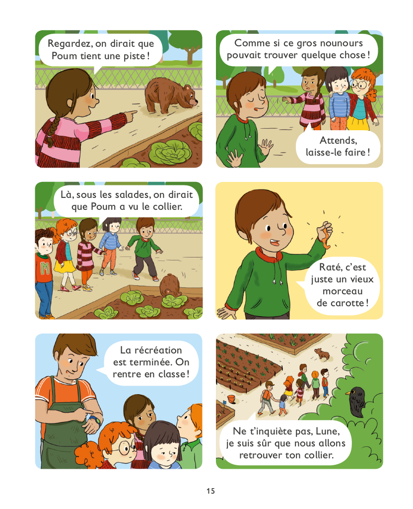 A l’Ecole des animaux, il y a une classe de CP et une classe de CE1. Mais comme son nom l’indique, il y a aussi des animaux : un chat, une cane et ses poussins, des petits cochons, des lapins, un ourson, un perroquet... et beaucoup d’autres. Et avec toute cette petite ménagerie, il arrive souvent de drôles d’aventures ! Aujourd’hui, Lune est triste d’avoir perdu son collier et Marco est un peu dans la lune..
