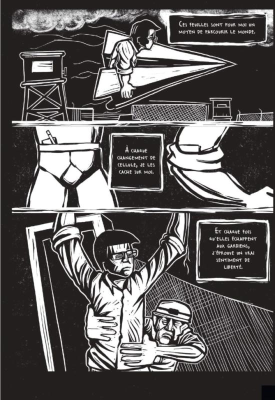 Au fil des pages, les récits rapportés par l’oiseau illustrent combien la prison est plus vaste qu’un simple bâtiment, combien elle va au-delà d’une cellule, s’étendant aux villes et villages... Mais c’est aussi la résistance des Palestiniens, leur espérance, leur confiance et leur refus de partir que l’auteur retrace dans ces planches en noir et blanc réalisées en linogravure.