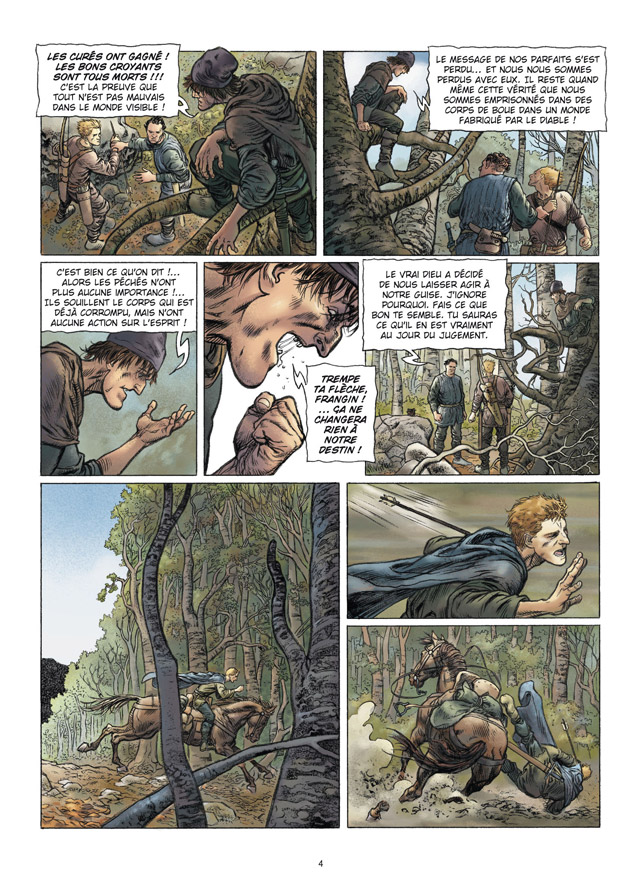 Tout juste échappé de la prison de Carcassonne, Guilhem cavale vers le village d’Aryens, là où il espère retrouver Nita. Inquiet, il redouble d’efforts pour arriver au plus vite. Hélas, attaqué par trois soudards, il reçoit une flèche qui le cloue sur place. Sauvé par une jeune bergère, il parvient enfin à destination. Mais, une fois sur place, tous le fuient comme s’il était pestiféré...