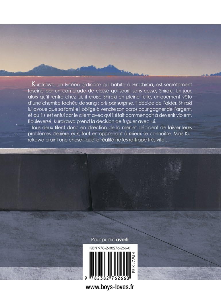Kurokawa, un lycéen ordinaire qui habite à Hiroshima, est secrètement fasciné par un camarade de classe qui sourit sans cesse, Shiraki. Un jour, alors qu’il rentre chez lui, il croise Shiraki en pleine fuite, uniquement vêtu d’une chemise tachée de sang ; pris par surprise, il décide de l’aider. Shiraki lui avoue que sa famille l’oblige à vendre son corps pour gagner de l’argent, et qu’il s’est enfui car le client avec qui il était commençait à devenir violent. Bouleversé, Kurokawa prend la décision de fuguer avec lui.Tous deux filent donc en direction de la mer et décident de laisser leurs problèmes derrière eux, tout en apprenant à mieux se connaître. Mais Kurokawa craint une chose : que la réalité ne les rattrape très vite...