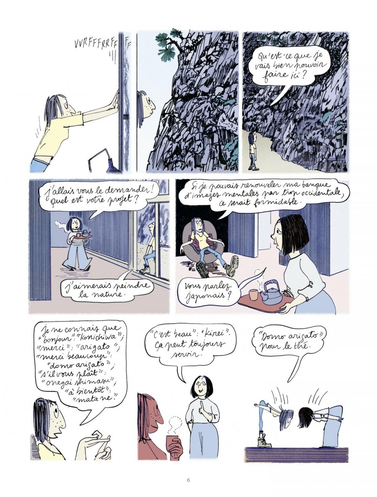 Catherine Meurisse a résidé plusieurs mois à la Villa Kujoyama, une résidence d’artistes située à Kyoto. Cherchant à renouveler son inspiration, elle s’est immergée dans les paysages japonais. Un an plus tard, elle séjournait de nouveau au Japon, quand le typhon Hagibis dévastait une partie du pays. De ces deux voyages, placés sous le signe de la nature, tour à tour muse et dévastatrice, est né l’album La Jeune femme et la mer