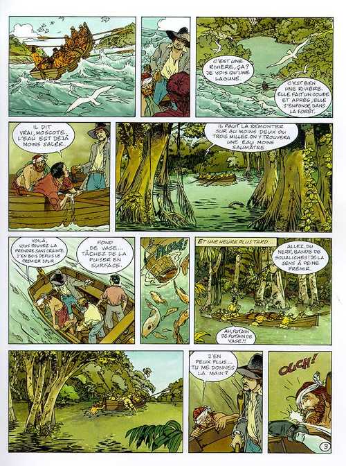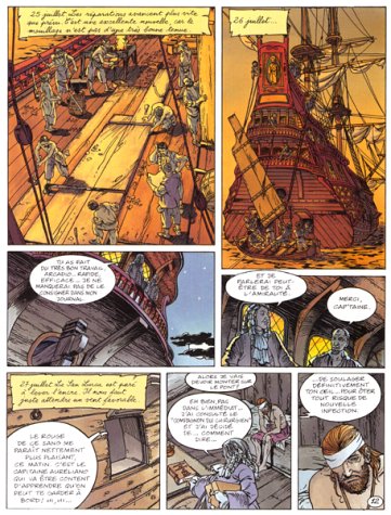 La vie a bord est assez féroce. Au moment ou Cornic est censé se battre contre des rats dans la Fosse aux lions pour alimenter les paris de l’équipage, il a l’excellente idée d’échanger sa vie contre la promesse du trésor de Porto-Bello : cent cinquante coffres engloutis par moins de vingt metres de fond, pleins d’or, d’argent et de pierres précieuses. Le voila donc en sursis mais les choses se gâtent sous la forme d’un bateau plein de pirates anglais