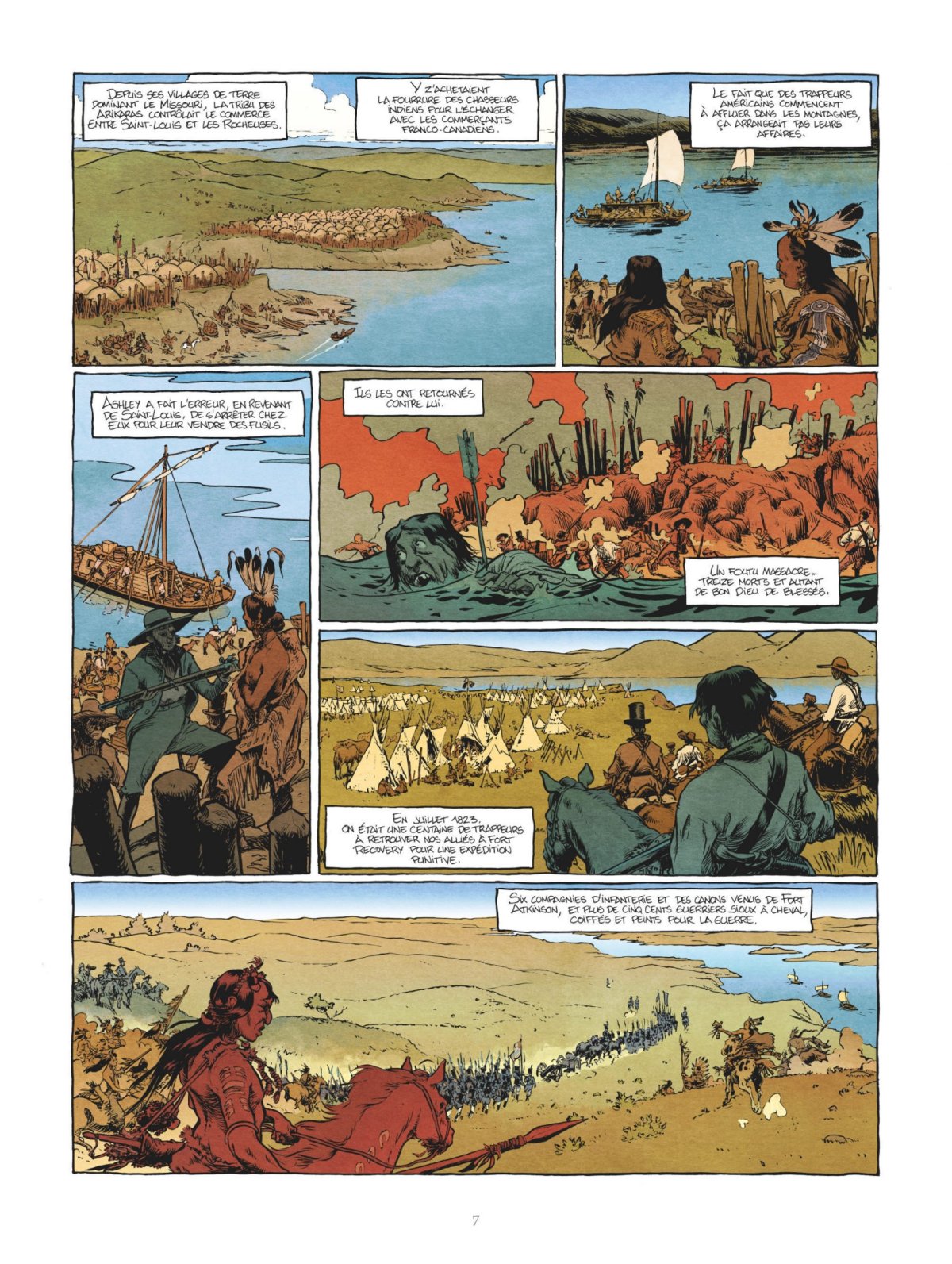 En 1822, le jeune Jim n’a pas encore 18 ans mais il sait que l’aventure l’attend à l’ouest de Saint-Louis, cette ville marchande et cosmopolite du Missouri située à l’extrémité du front pionnier. Le coeur ouvert à l’inconnu, il débute sa carrière de trappeur en s’engageant dans la première grande expédition, celle de William Ashley, qui avec deux bateaux et une centaine de volontaires, remonte la haute vallée du Missouri à la recherche de « l’or brun des Rocheuses », les peaux de castor. Au péril de sa vie, il affronte les hivers redoutables et les grizzlys, rencontre les peuples amérindiens pour lesquels il nourrit un profond respect et explore les territoires les plus reculés de l’Ouest, du Grand Lac salé aux geysers de Yellowstone. Démontrant un courage, une sérénité et une endurance à toute épreuve, il connaît de folles aventures dans les régions montagneuses, se fiant à son instinct de survie et son sens exceptionnel de l’orientation pour se tirer d’affaire. Au fil du temps, sa renommée est si établie que les convois de pionniers et les détachements de cavalerie s’arrachent ses services pour les guider au milieu d’une nature hostile et sauvage ! Devenu une légende vivante, Jim Bridger force l’admiration et nous ouvre les portes d’un âge d’or où trappeurs, négociants et Indiens se réunissaient chaque année dans les somptueuses vallées du Wyoming pour commercer et se divertir. La conquête de l’Ouest n’en est encore qu’à ses débuts et va bientôt bouleverser cet équilibre. Une époque passionnante de l’histoire américaine dans lequel éclot le mythe des Mountain Men, ces êtres rudes, entreprenants et individualistes, vivant en osmose avec un territoire qu’ils ont vu disparaître sous les roues des chariots qu’ils avaient eux-mêmes guidés...