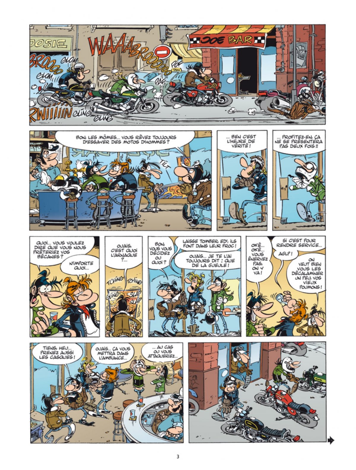 Les JBT reviennent pour un septième tome qui transpire la gomme brûlée et les freinages ratés. Joe Bar Team revient pour un septième tome qui transpire la gomme brûlée et les freinages ratés.Il faut bien l’admettre, Jérémie Lapurée, Pierrot Lafouine et Paul Position n’ont pas beaucoup mûri... Ils ont tout de même troqué leurs anciennes montures pour des engins plus modernes, dignes du statut de pilotes expérimentés qu’ils ont acquis de haute lutte contre vents et radars. Ces nouvelles motos plus puissantes mais tout aussi capricieuses vont-elles améliorer leur fameux style de pilotage ? Rien n’est moins sûr, d’autant qu’à l’issue d’un stage sur circuit Jéjé a fait la connaissance d’un quatrième larron tout aussi raisonnable que lui : Marius Sonpeneu, Marseillais pur-sang, venu s’initier aux joies de la glisse dans une ville du Nord où, comme chacun le sait : « le mouillé, c’est dans la tête ».Pour ce septième opus, le Joe Bar Team nous revient fidèle à sa devise : « Quand les rétros passent, tout passe. »