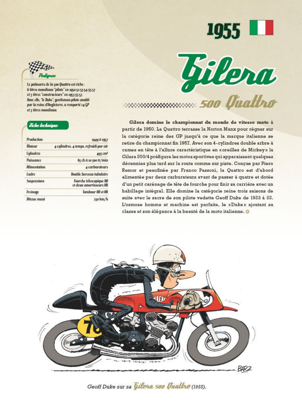 Joe Bar Team présente… les motos mythiques des champions de quartier. Familiarisez-vous au travers de fiches illustrées avec une sélection de motos sportives devenues cultes, produites entre 1955 et 1985. Parmi elles, retrouvez par exemple la Honda 1000 CBX de 1978 pilotée par Éd’ la Poignée ; la Triumph 650 Bonneville de 1961 pilotée par Joe l’arsouille ; la Suzuki 750 GSX-R de 1985 pilotée par Jeannot la Case et bien d’autres !Comportant un bref historique du modèle en question, ses particularités techniques, son palmarès en championnat, ainsi que quelques trucs et astuces bien utiles pour apprendre à dompter la bête, chaque fiche est rédigée par Pierre Vedel et illustrée brillamment tour à tour par une bande de spécialistes en la matière : ’Fane, Juan... et Bar2 qui nous fait le plaisir de réaliser, outre la couverture, une vingtaine de dessins inédits !