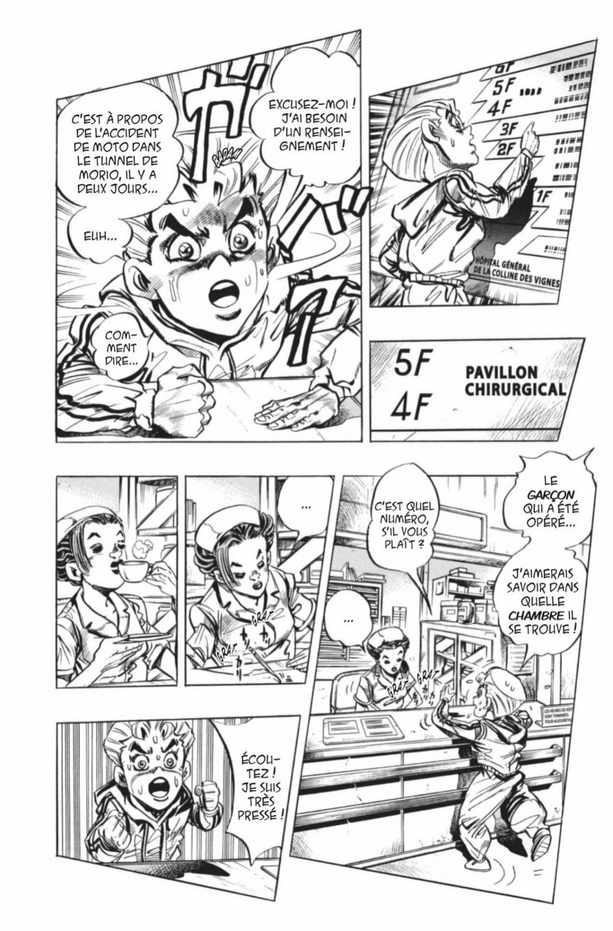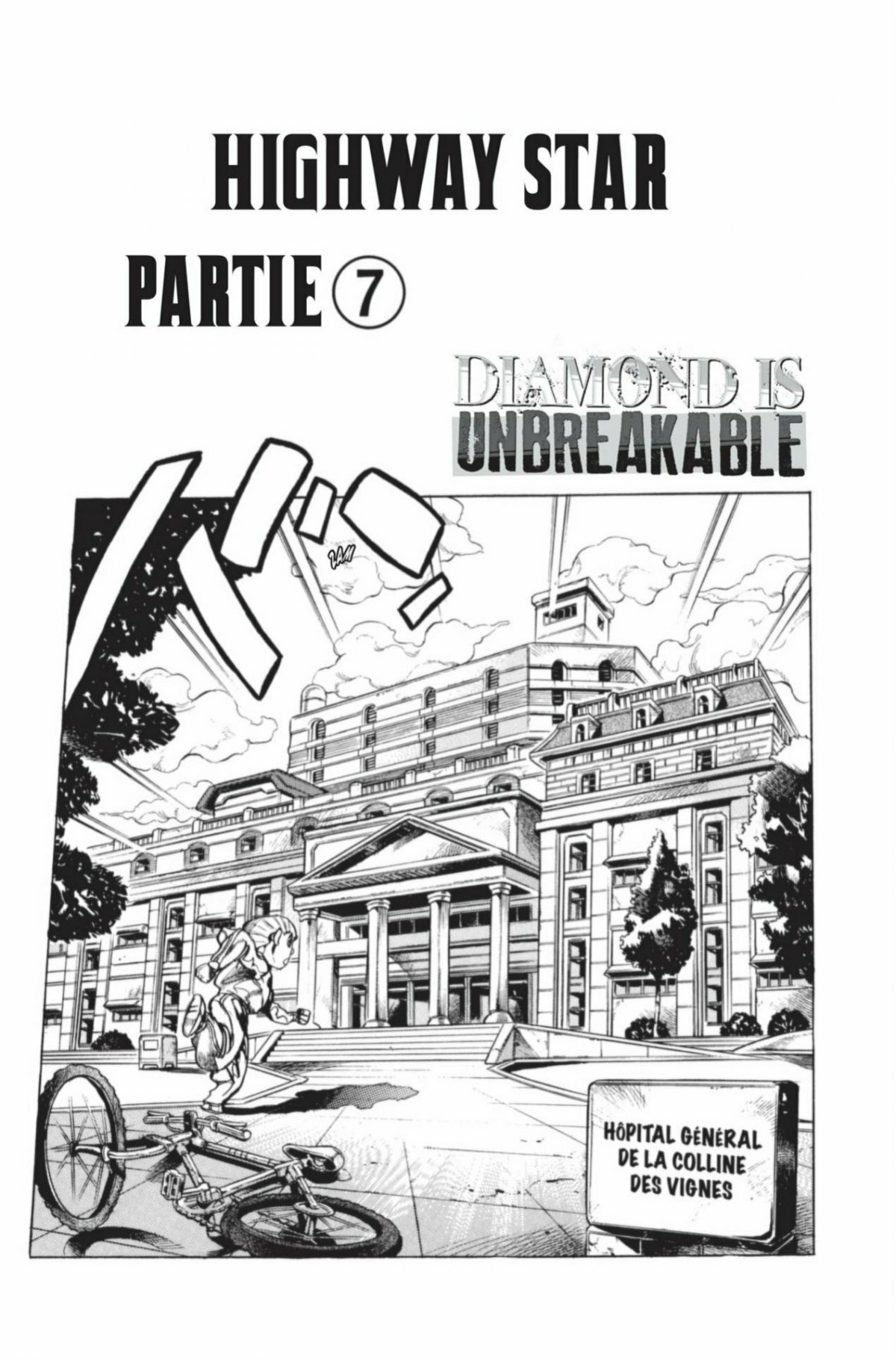Josuke est poursuivi par Highway Star, un stand sans aucun point faible ! S’il ralentit en-dessous des 60km/h, il est cuit. Sa seule chance : trouver l’hôte, qui serait déjà grièvement blessé et en rétablissement dans un hôpital. Parallèlement, Yoshikage Kira est confronté à un chat bien étrange, aussi fascinant que dangereux. Serait-ce un allié ou un ennemi ?