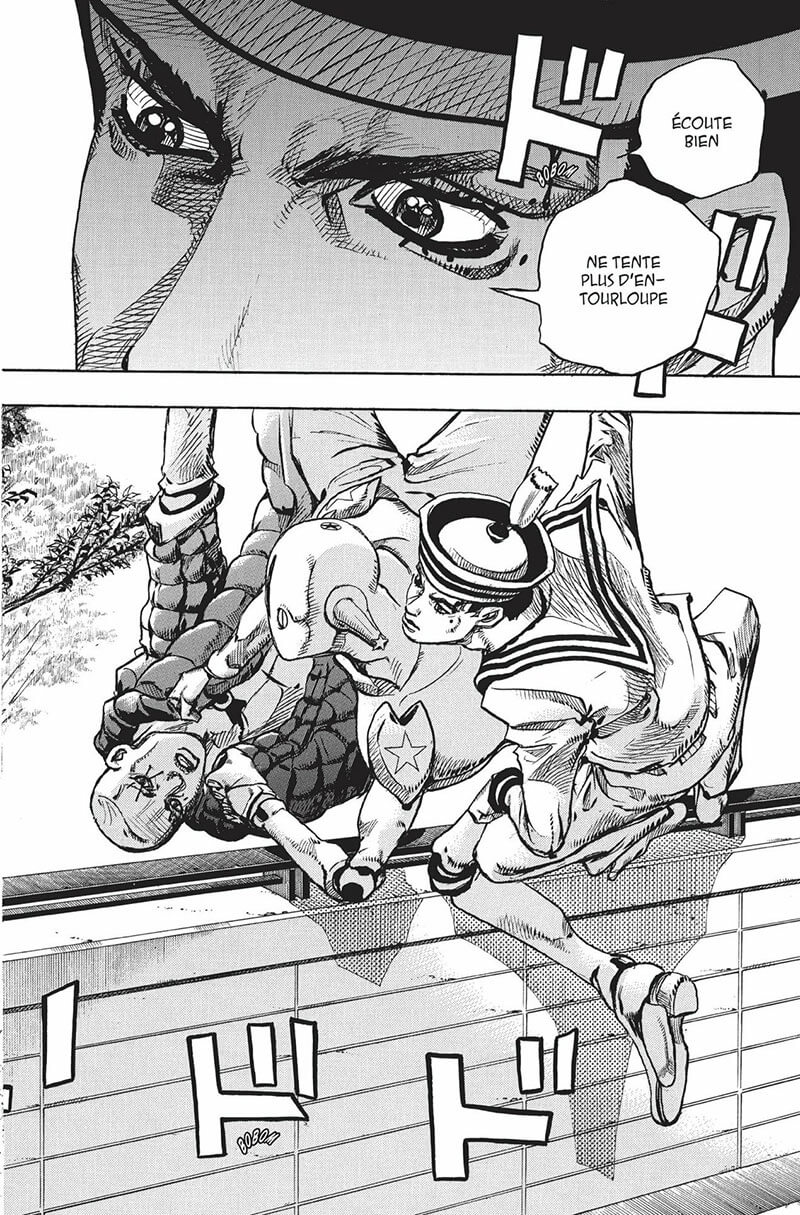 Le jeune homme amnésique s’est introduit avec Yasuho dans l’appartement de Kira, seul indice lui permettant de retrouver sa propre identité. Mais ils sont tous les deux pris pour cibles par le Stand du « voisin du dessus » qui les attaque sans se dévoiler ! Qui est donc cet homme ?!