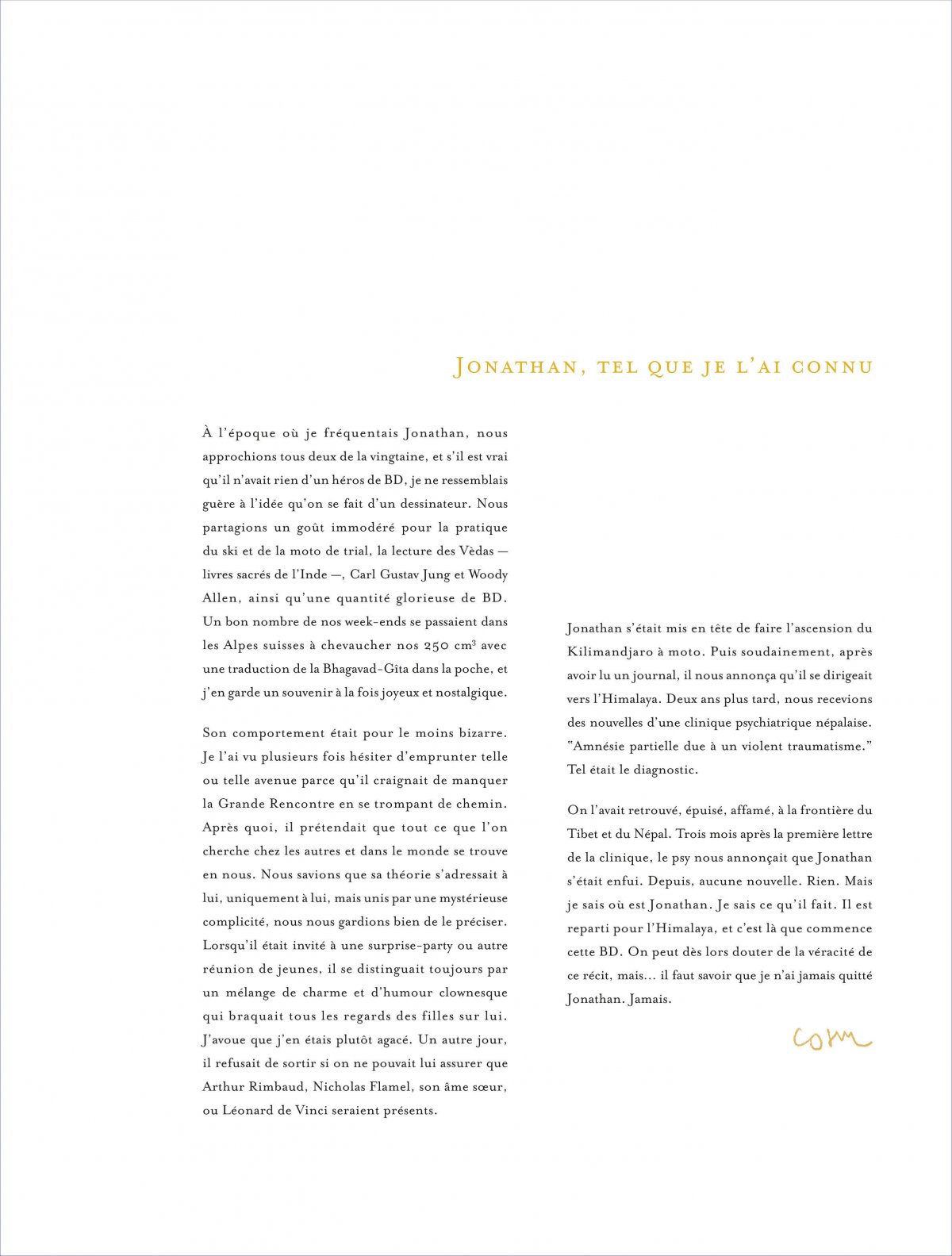 Ni héros ni anti-héros, Jonathan, dès son apparition dans le journal Tintin, a incarné une bande dessinée nouvelle, où l’aventure est aussi intérieure. Cette singularité, Jonathan la doit à son créateur, Cosey, qui lui a prêté ses sentiments, ses interrogations, ses impressions de voyages et ses goûts artistiques, réalisant ainsi une sorte de fiction autobiographique. Entre art-book, monographie, recueil d’entretiens et carnet de voyage, « Jonathan, une autobiographie imaginaire en BD » revient sur cette oeuvre aussi unique que personnelle. De réflexion en souvenir, de croquis en photo de repérage, d’aquarelle en référence culturelle, Cosey nous ouvre les portes de son atelier, pour notre plus grand plaisir.