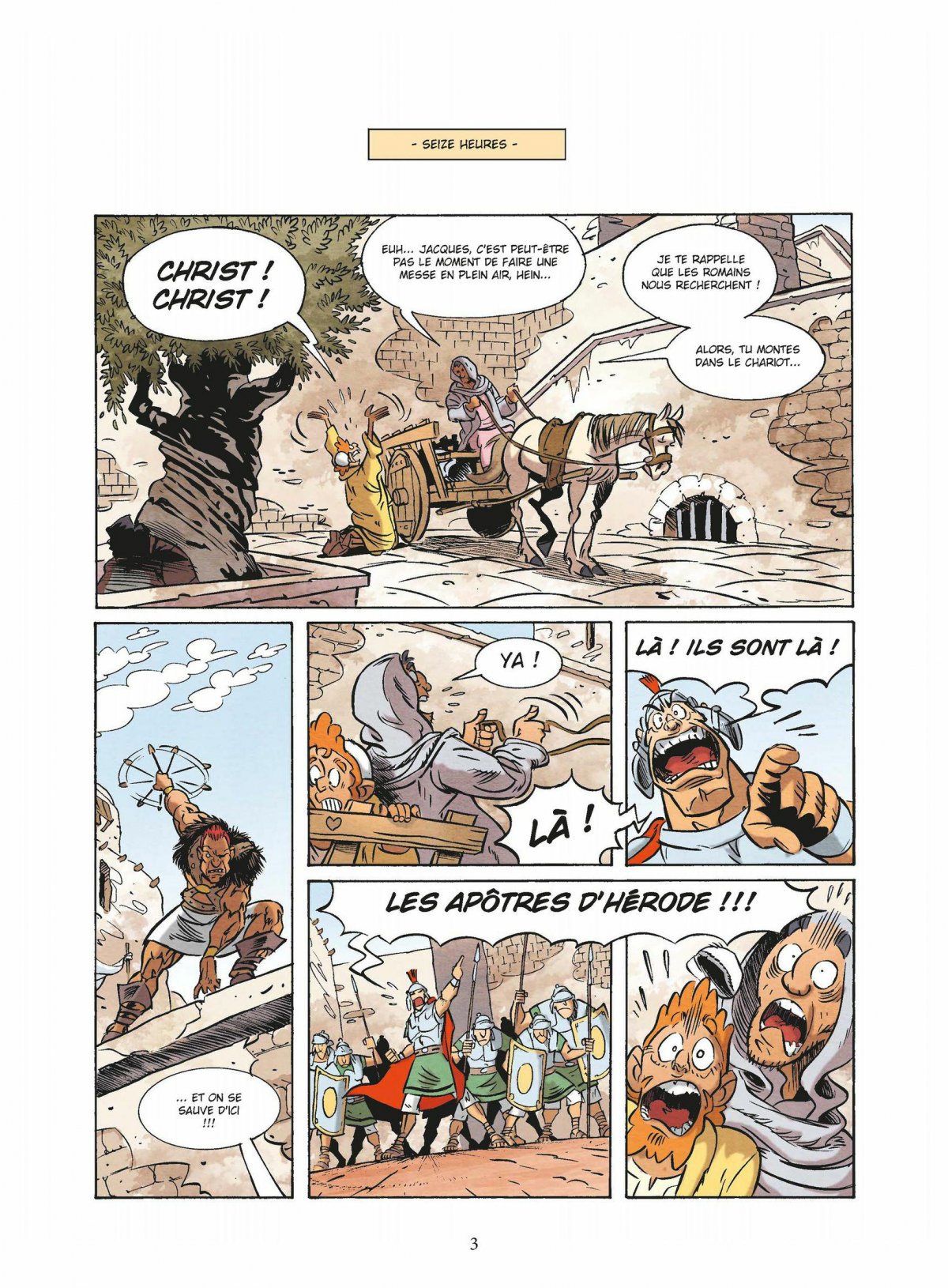 Alors que les apôtres sont pourchassés par tous, que les Romains se préparent à mettre la ville à feu et à sang sur ordre du nouvel envoyé de Rome, le terrible Caïus, et que les zélotes s’apprêtent enfin à lancer leur révolution par les catacombes de la ville... deux apôtres, les deux Jacques, oubliés de tout le monde, viennent de trouver le fameux « chariot d’Hérode » recherché par tous depuis des heures... avec un corps enrubanné à l’intérieur.