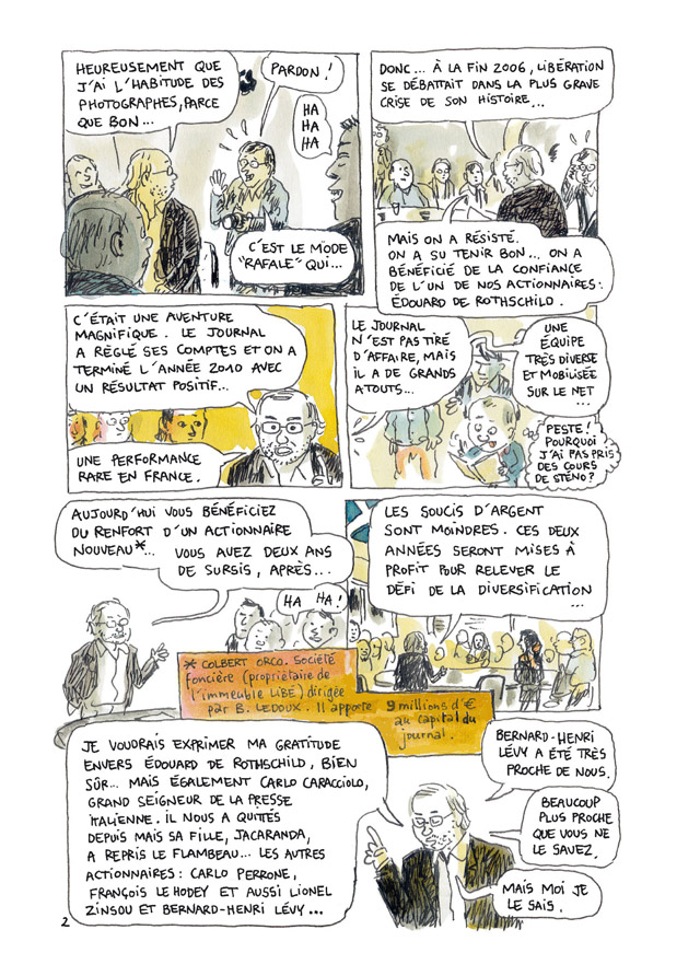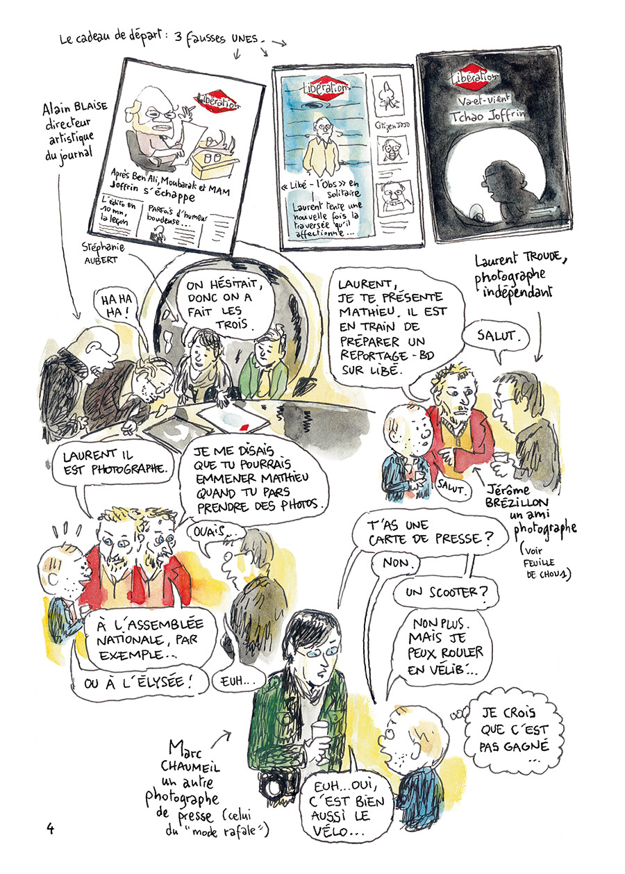 Des salles de rédaction à la machine à café, Mathieu Sapin dévoile les coulisses de Libération. Présent pendant le changement de direction, il a circulé en libre accès dans les locaux et a côtoyé l’équipe durant un temps fort de la vie du journal. Carnets en mains, il a croqué les petits et grands moments qui animent le quotidien d’une des plus importantes rédactions de presse écrite en France.
