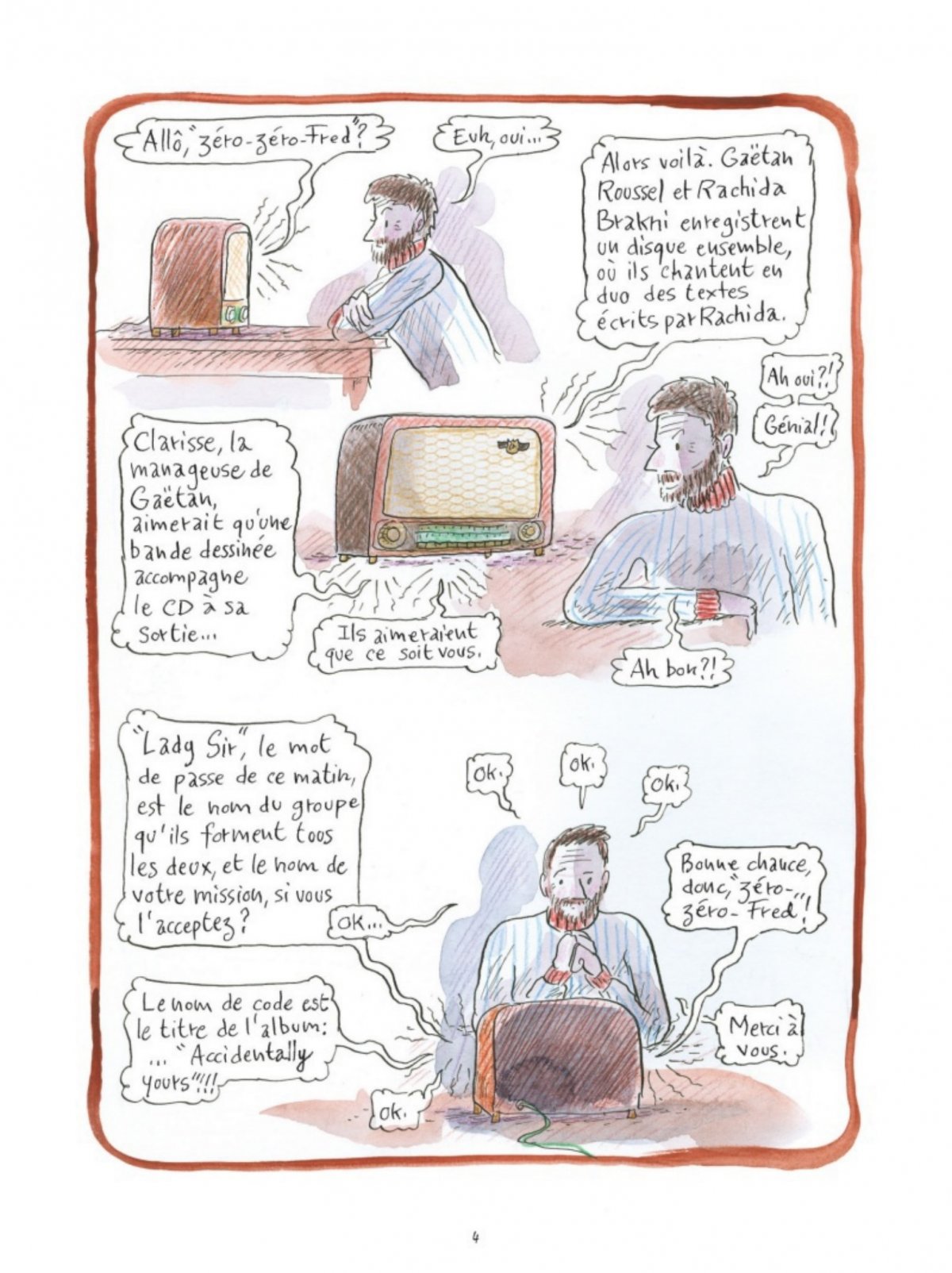 Elle est comédienne, ils sont musicien et dessinateur de BD. A priori, ils n’avaient pas grand-chose en commun mais la musique les a réunis. Cet album est l’histoire de deux rencontres. D’abord celle de Rachida Brakni et de Gaëtan Roussel et la naissance de leur nouveau groupe « Lady Sir ». Puis celle du duo avec Fred Bernard pour le lancement le 14 avril de leur premier album : Accidently Yours. En studio ou chez eux, de Paris à Lisbonne, le dessinateur les a suivis, accompagnés, a interviewé leurs proches, pour livrer, en texte et en images, les chroniques atypiques et touchantes d’un projet musical qui ne l’est pas moins.Chansons illustrées, anecdotes de studios, témoignages, parcours de vie... Comme à son habitude, l’auteur se joue des codes, multiplie les expériences graphiques et narratives dans un nouvel album qui, loin d’être didactique, se veut plutôt une ode aux belles rencontres et au rapprochement des êtres ; et une lettre d’amour à la création artistique.