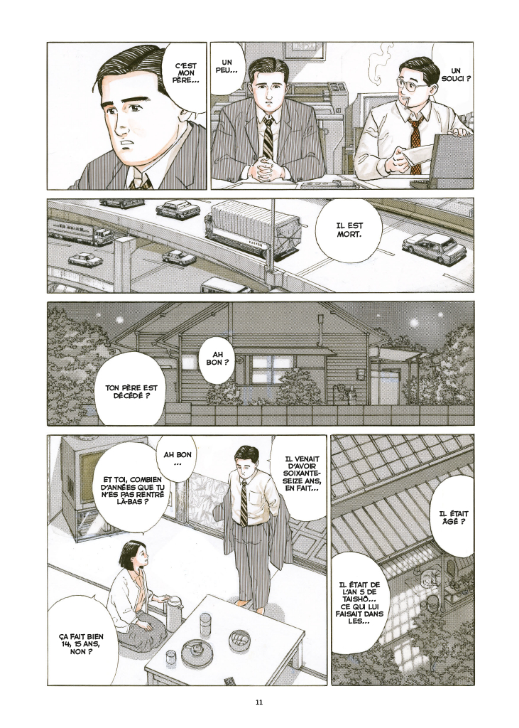 Contrairement à l’impression suggérée par son titre, Le Journal de mon père n’est pas un récit autobiographique. Jirô Taniguchi a simplement "planté" son scénario à Tottori, sa ville natale, où il a tant de repères et de souvenirs. Le héros de cette histoire s’appelle Yoichi Yamashita et travaille à Tokyo dans une agence de design. Apprenant la mort de son père, il revient après une très longue absence à Tottori, la ville qui l’a vu grandir. Au cours d’une veillée funèbre très arrosée, le passé des années 50 et 60 ressurgit : l’incendie qui a ravagé la ville et la maison familiale, le dur labeur pour la reconstruction, le divorce de ses parents, ses souffrances d’enfant... Lors de cette veillée, chaque membre de la famille apporte un éclairage nouveau sur la personnalité de ce père que Yoichi tenait jusque-là pour responsable du désastre familial. Le fils réalise finalement, mais trop tard, qu’il a sans doute été le seul responsable de leur douloureuse incompréhension.