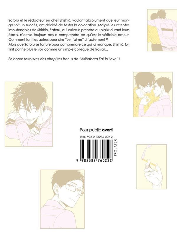 Satoru et le rédacteur en chef Shishiô, voulant absolument que leur manga soit un succès, ont décidé de tester la colocation. Malgré les attentes insoutenables de Shishiô, Satoru, qui arrive à prendre du plaisir durant leurs ébats, n’arrive toujours pas à comprendre ce qu’est le véritable amour. Comment font les autres pour dire "Je t’aime" si facilement ?Alors que Satoru se torture pour comprendre ce qui lui manque, Shishiô, lui, finit par ne plus le voir comme un simple collègue de travail...En bonus retrouvez des chapitres bonus de "Akihabara Fall in Love" !