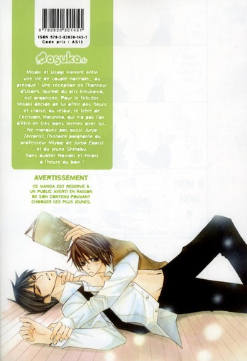 Misaki et Usagi mènent enfin une vie de couple normale... ou presque ! Une réception en l’honneur d’Usami, lauréat du prix Kikukawa, est organisée. Pour le féliciter, Misaki décide de lui offrir des fleurs et croise, au retour, le frère de l’écrivain, Haruhiko, qui n’a pas l’air d’être en très bons termes avec lui... Ne manquez pas aussi Junjo Terrorist, l’histoire poignante du professeur Miyagi de Junjo Egoist et du lycéen Shinobu. Sans oublier Nowaki et Hiroki à l’heure du bain !
