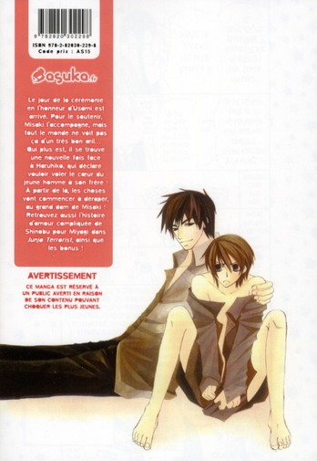Enfin impliqué dans la vie d’Usagi, Misaki accompagne celui-ci à la cérémonie de remise du prestigieux prix Kikukawa. C’est alors qu’il se trouve une nouvelle fois face à face avec Haruhiko, qui déclare vouloir voler le coeur du jeune homme à son frère ! À partir de là, les choses vont commencer à déraper, au grand dam de Misaki ! Retrouvez aussi l’histoire d’amour compliquée de Shinobu pour Miyagi dans Junjo Terrorist, ainsi que les bonus !