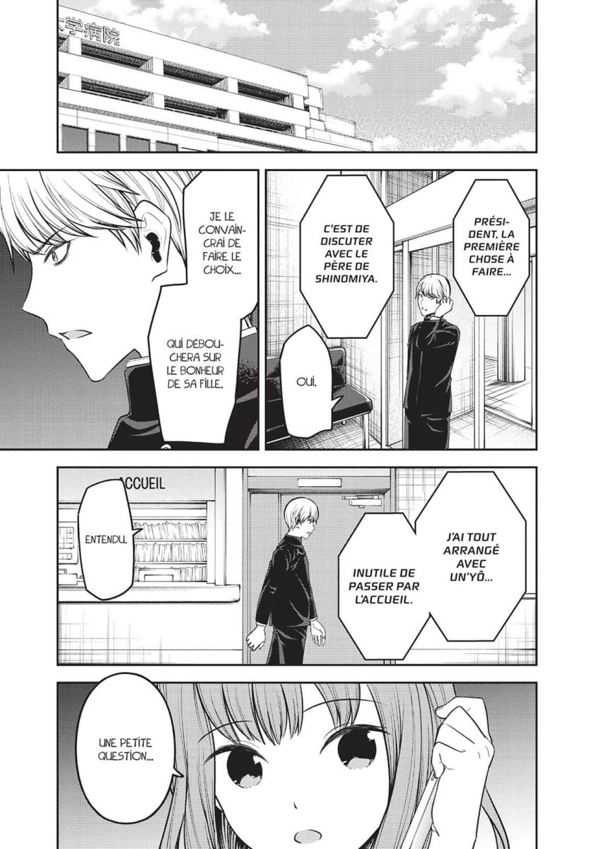 Cela fait maintenant plusieurs mois que Miyuki Shirogane et Kaguya Shinomiya sortent ensemble, et l’histoire entre dans son arc final ! Alors que le départ de Shirogane pour l’étranger approche, un scandale éclate chez les Shinomiya. Entraînée au coeur d’une lutte de pouvoir intestine, Kaguya rompt avec Shirogane car on les menace, lui et sa famille... Mais le président et le BDE au complet se mobilisent pour sauver la jeune fille !
