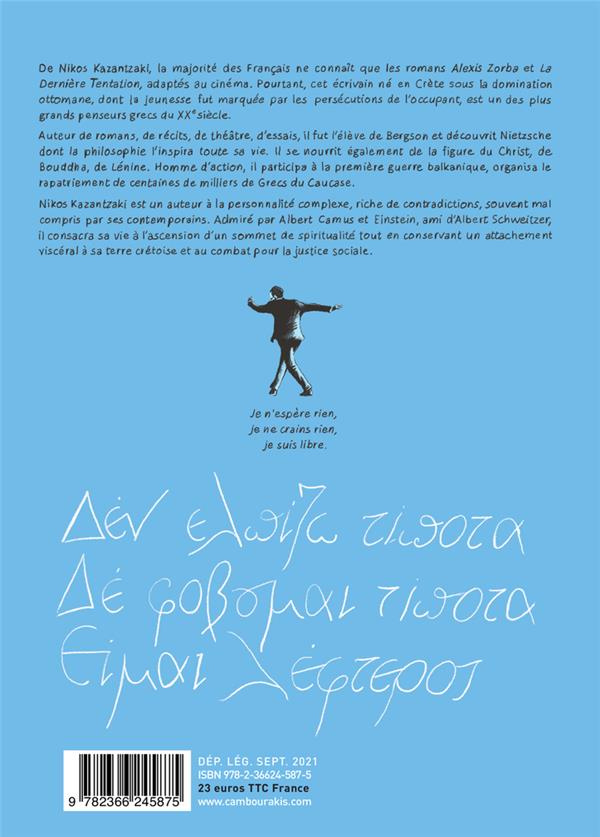 Les auteurs de Manolis et Gilets de sauvetage se retrouvent pour une bande dessinée ambitieuse, en deux volumes, qui illustre l’insondable mystère Nikos Kazantzakis. On y découvre de l’intérieur l’auteur mythique d’Alexis Zorba, figure clé iconoclaste et aventurière du premier vingtième siècle littéraire grec.