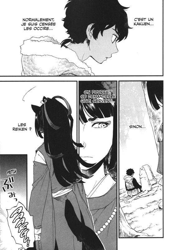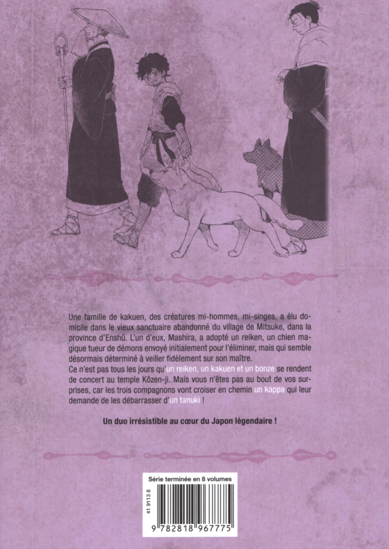Un duo irrésistible au coeur du Japon légendaire ! Une famille de kakuen, des créatures mi-hommes, mi-singes, a élu domicile dans le vieux sanctuaire abandonné du village de Mitsuke, dans la province d’Enshû. L’un d’eux, Mashira, a adopté un reiken, un chien magique tueur de démons envoyé initialement pour l’éliminer, mais qui semble désormais déterminé à veiller fidèlement sur son maître. Ce n’est pas tous les jours qu’un reiken, un kakuen et un bonze se rendent de concert au temple Kôzen-ji. Mais vous n’êtes pas au bout de vos surprises, car les trois compagnons vont croiser en chemin un kappa qui leur demande de les débarrasser d’un tanuki ! Un vrai plongeon dans les contes et légendes du Japon des temps anciens !