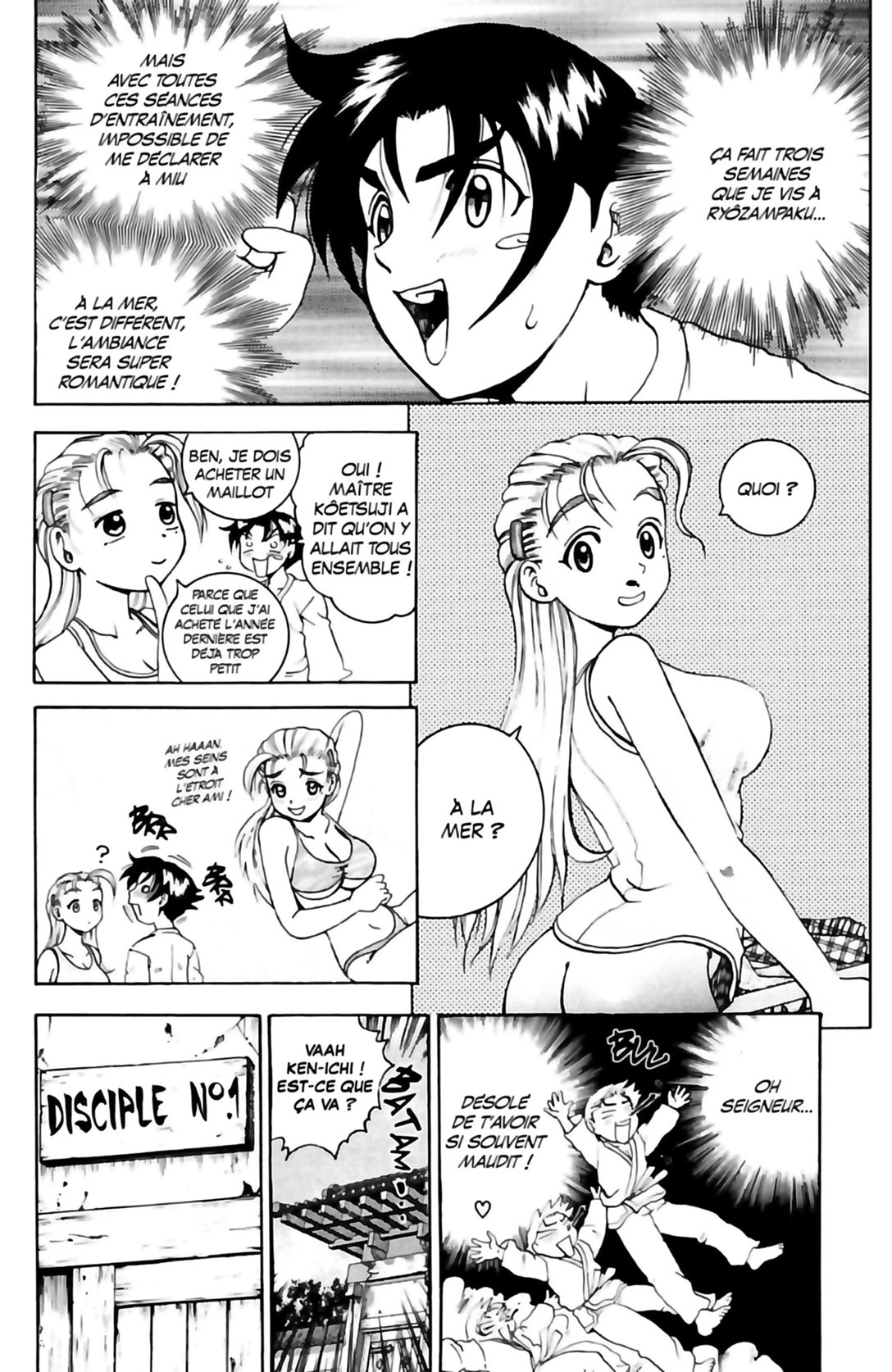 Après avoir affronté différents ennemis, Ken-Ichi va aujourd’hui affronter un adversaire de taille : sa peur de l’eau ! En effet, bien qu’il soit parvenu à convaincre la belle Miu de l’accompagner à la plage, ses maîtres sont aussi de la partie, et décident de lui enseigner la natation de manière assez peu orthodoxe. Shiguré, la silencieuse ninja, parviendra-t-elle à lui enseigner l’art ancestral de la natation shinobi ?