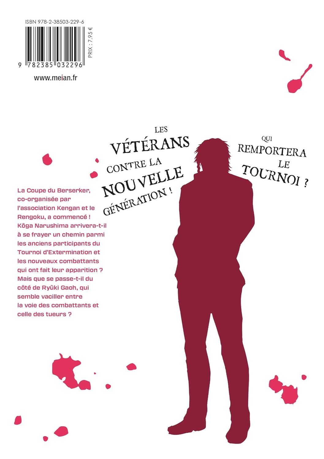La Coupe du Berserker, co-organisée par l’association Kengan et le Rengoku, a commencé ! Kôga Narushima arrivera-t-il à se frayer un chemin parmi les anciens participants du Tournoi d’Extermination et les nouveaux combattants qui ont fait leur apparition ? Mais que se passe-t-il du côté de Ryûki Gaoh, qui semble vaciller entre la voie des combattants et celle des tueurs ?