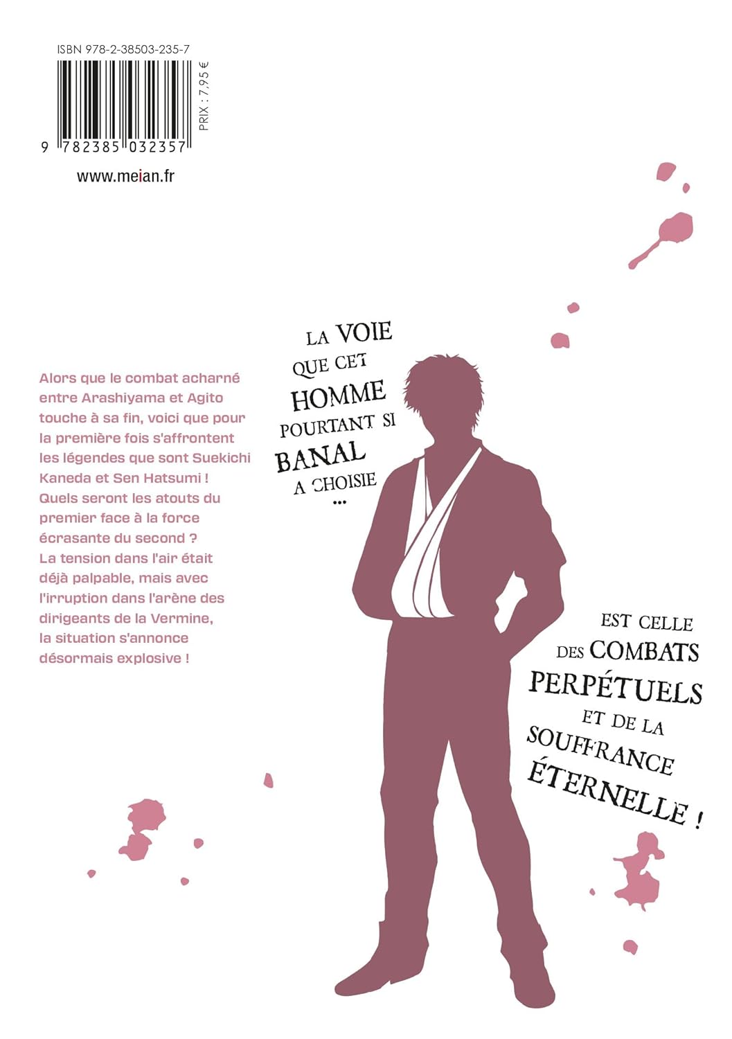 Alors que le combat acharné entre Arashiyama et Agito touche à sa fin, voici que pour la première fois s’affrontent les légendes que sont Suekichi Kaneda et Sen Hatsumi ! Quels seront les atouts du premier face à la force écrasante du second ? La tension dans l’air était déjà palpable, mais avec l’irruption dans l’arène des dirigeants de la Vermine, la situation s’annonce désormais explosive !