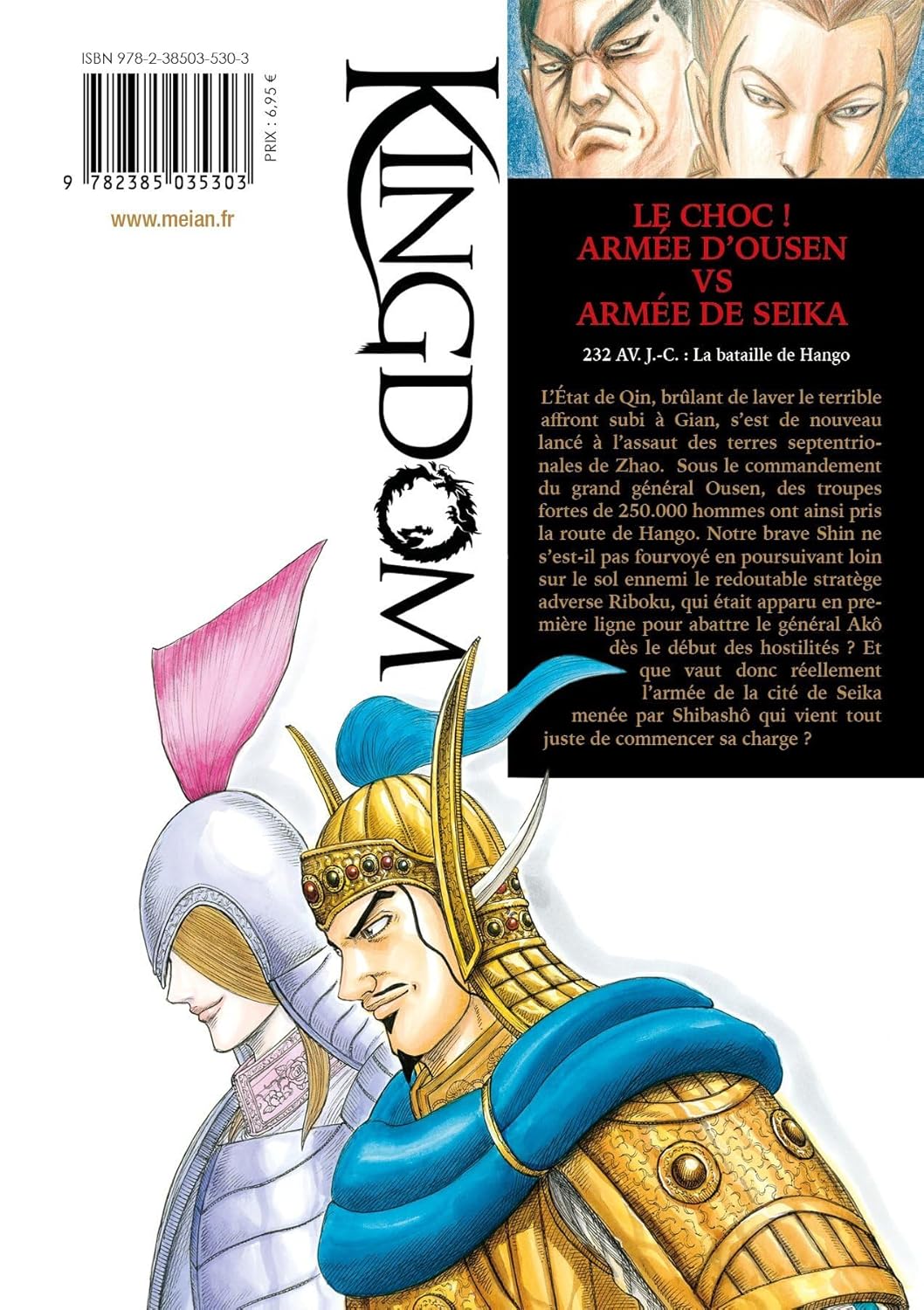 232 av. J.-C. : La bataille de Hango. L’État de Qin, brûlant de laver le terrible affront subi à Gian, s’est de nouveau lancé à l’assaut des terres septentrionales de Zhao. Sous le commandement du grand général Ousen, des troupes fortes de 250.000 hommes ont ainsi pris la route de Hango. Notre brave Shin ne s’est-il pas fourvoyé en poursuivant loin sur le sol ennemi le redoutable stratège adverse Riboku, qui était apparu en première ligne pour abattre le général Akô dès le début des hostilités ? Et que vaut donc réellement l’armée de la cité de Seika menée par Shibashô qui vient tout juste de commencer sa charge ?