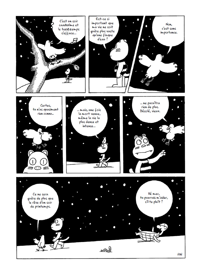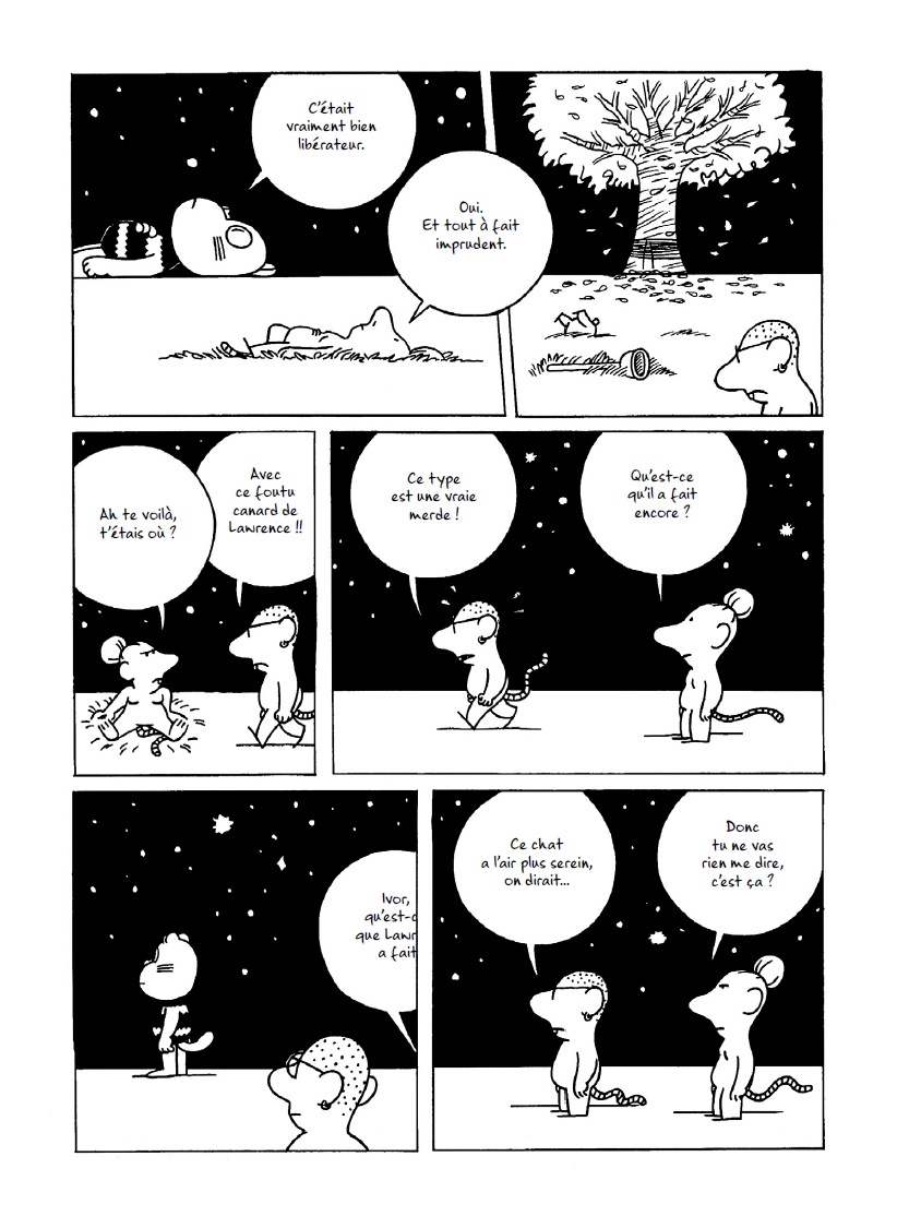 Le chat qui murmurait à l’oreille des chevaux... Klaus est un chat contemplatif et mélancolique qui vit sa vie, qu’il veut paisible, au milieu de ses amis oiseaux ou rats à face humaine. Profondément humaniste, il n’en reste pas moins un prédateur et, de temps à autre, il se retrouve confronté à sa nature profonde de félin qui l’amène parfois à manger un de ses amis ou à dévorer leurs oeufs. Il est aussi amoureux d’une jument, mais la nature les sépare, sans compter que ses sentiments restent secrets et probablement non partagés. Calme, modéré et philosophe, tout son entourage le pousse à être plus ambitieux et à faire de l’argent, ce qui est assez ridicule dans la mesure où Klaus reste un chat.