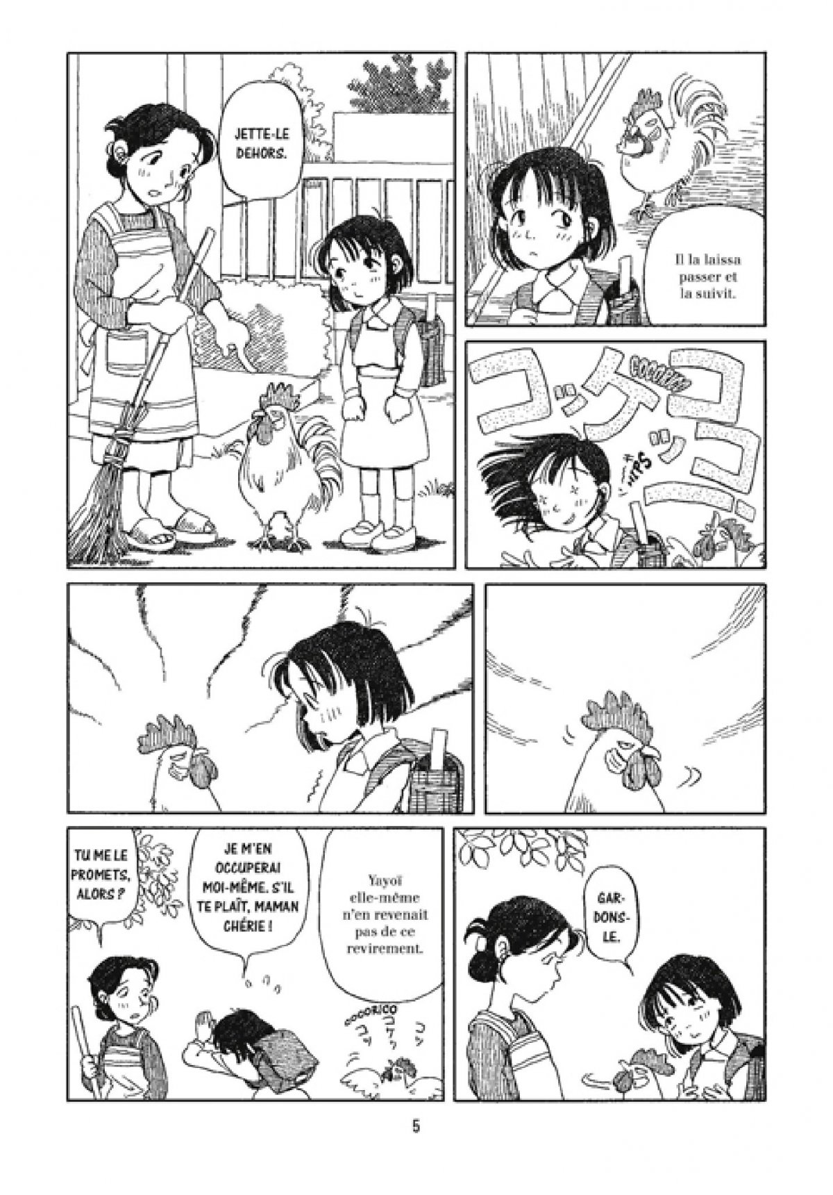 Koko raconte, par le biais de courts épisodes, l’histoire touchante d’une collégienne japonaise qui décide un beau jour d’adopter le coq qu’elle croise au retour de l’école. Mais la cohabitation s’avère plus compliquée que prévue : entre les cris tonitruants au réveil, les coups de bec assénés aux copines un peu trop curieuses, ou l’appétit insatiable de la bête qui dévore l’assiette en même temps que les graines, s’occuper d’un coq requiert patience, dévotion et surtout une bonne dose d’ingéniosité ! Cette oeuvre en un seul volume est signée Fumiyo Kono, une jeune mangaka qui reçut le prix Tezuka en 2005.Outre un graphisme somptueux et un côté ligne claire des plus agréables, cette auteure n’a pas son pareil pour nous émouvoir et nous faire rire avec un sens de la mise en scène et de la composition d’une grande fraîcheur. Une lecture à conseiller aux plus petits, dans la veine du Totoro de Miyazaki, mais que les adultes ayant gardé une âme d’enfant ne doivent surtout pas rater eux aussi !