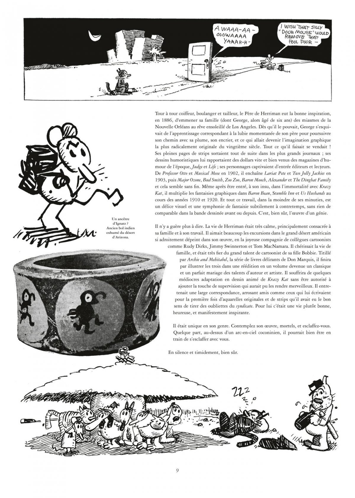 Les Rêveurs sont très fiers de remettre dans la lumière cette bande dessinée américaine (1913-1944) restée longtemps oubliée en France. C’est donc à une nouvelle génération de lecteurs mais aussi aux passionnés de bande dessinée que sont proposés aujourd’hui de découvrir ou de redécouvrir les Sunday strips parus voici plus de 85 ans. Ce premier volume d’une collection de quatre, regroupe les strips de 1925 à 1929. Dans le comté de Coconino, retrouvez les aventures de Krazy Kat, Ignatz Mouse, du Sergent Pupp et d’une brique qui ont ravi des générations d’Américains. Sous une histoire très simple d’apparence, chaque planche du dimanche explose par une mise en page inventive, un langage complexe mêlant anglais, argot, yiddish, et espagnol et un dessin toujours au service de la narration, de l’humour et de la poésie. Krazy Kat reste une référence pour de nombreux auteurs de bande dessinée ainsi que de lecteurs. Indispensable dans toute bédéthèque digne de ce nom !