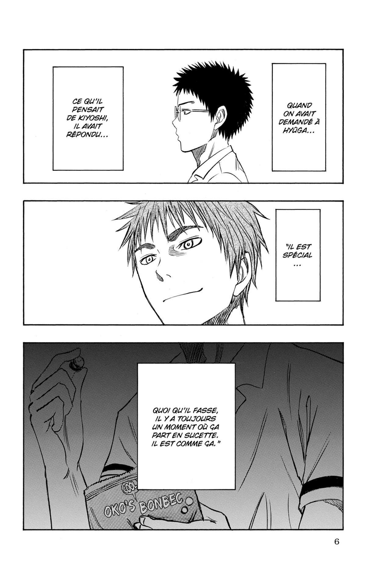 Afin de clore les stages d’été du club de basket de Seirin, Riko a mis au point une épreuve de courage censée détendre son équipe. Et pour ce faire, quoi de mieux que la visite d’une maison hantée ? Kagami et Kuroko s’improvisent détectives et vont devoir collaborer avec sang-froid pour venir à bout de ce défi ! Découvrez également la suite des aventures de Kise lors d’un group dating hors du commun !