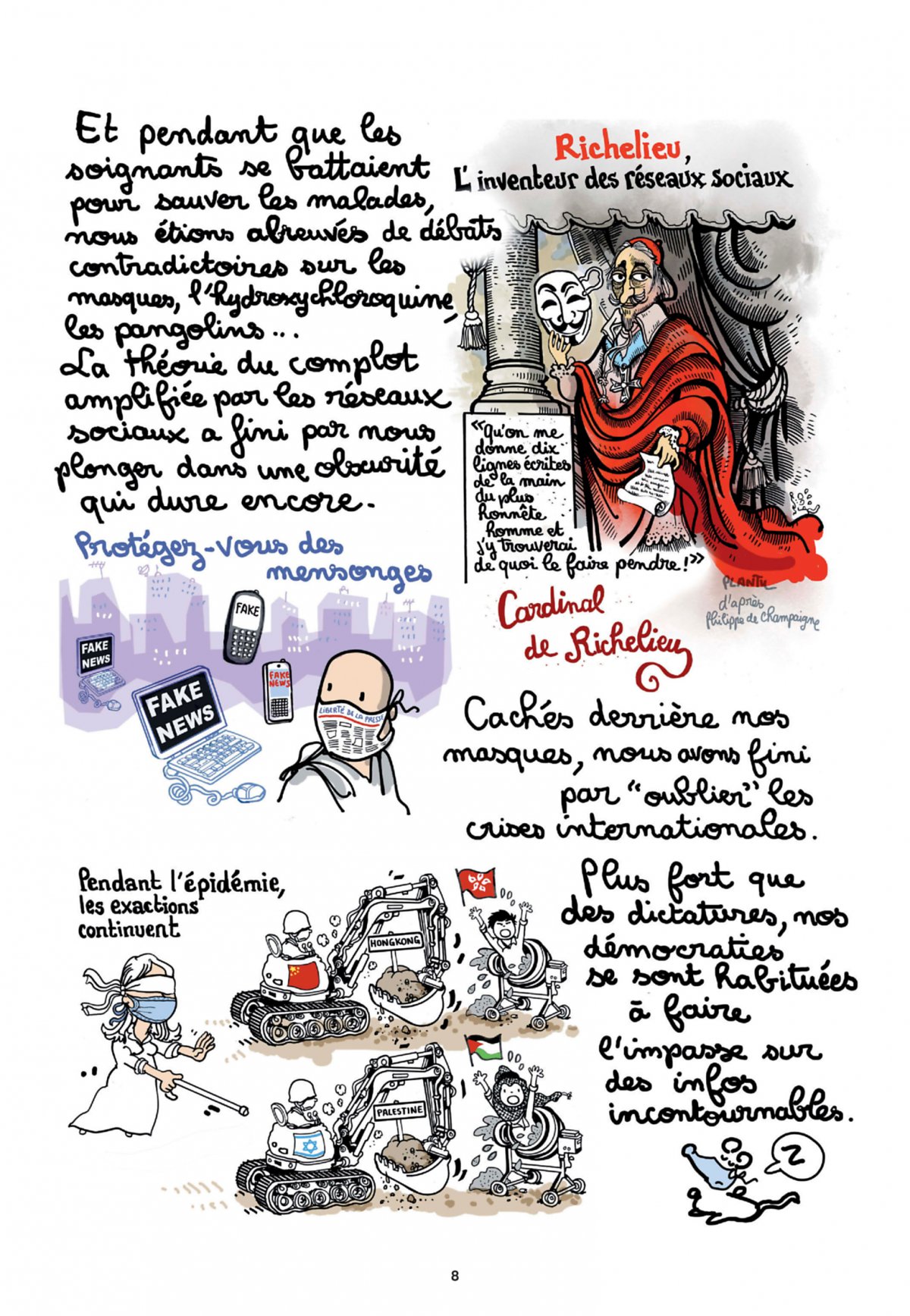 L’année de Plantu 2020 est évidemment placée sous le signe de la crise sanitaire qui a ébranlé la planète : Virus, confinement, héroïsme des soignants, pénurie et crise économique, sans oublier l’actualité politique ou internationale, passés à la moulinette du crayon acéré du dessinateur du journal le monde. À coups de Marianne sous perf et de souris masquées, Plantu immortalise avec humour et acuité cette année très parti.