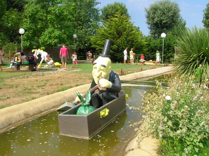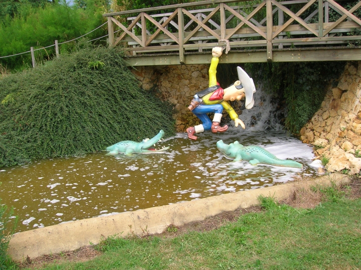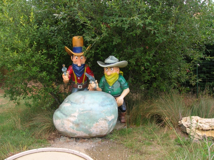 Les sculptures, fresques et autres dalles en rapport avec la bande dessinée sont généralement mises en place par des structures institutionnelles (municipalités, musées ou associations culturelles). La présence de nombreuses structures consacrées à l’univers de la série Lucky Luke au sein du mini-golf vendéen Le Marais en est d’autant plus remarquable que leur réalisation est particulièrement soignée, comme en témoignent les photos que nous vous présentons. Bonne visite !