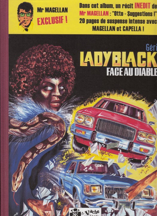 "Lady Black" est une histoire dessinée et scénarisée par Géri à la fin des années 70 et publiée dans le journal "Tintin" en 1980, "Lady Black" est une des premières héroïnes de couleur à apparaître dans le paysage bédé belge.Cette histoire de trente page est suivie d’un récit inédit de Mr Magellan en 20 pages : "Otto-Suggestions !".En bonus, nous republions également une interview de Géri réalisée par Bob de Groot lors de la parution de l’histoire. Bob de Groot nous a également fait le plaisir de rédiger une sympathique préface.Ces 2 histoires n’ont jamais été reprises en album auparavant. Pour rappel, Lady Black, cette jeune femme dont le métier est de retrouver les adolescents fugueurs, est embauchée par "Le Diable" alias Mario Conti, chef de la maffia de Chicago, dont l’héritier a disparu. Aidée discrètement par deux copains flics, Henry et Dany, elle est victime de plusieurs agressions et tentatives d’intimidation durant son enquête qui l’amène à Harlem. Elle localise le jeune fugueur qui s’avère être une fille que son père fait passer pour un garçon depuis toujours, de peur que ses ennemis n’apprennent que l’héritage du "Diable" ne tombe entre les mains d’une femme. C’est en fait lui qui a organisé les "accidents", l’agression avec la grue étant destiné à éliminer Scarlet, sa fille et Lady Black, en faisant porter le chapeau à ses rivaux. Mais Lady Black a compris à temps !