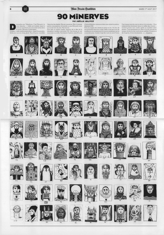 Emballé sous une élégante une en négatif, sur le fond noir de laquelle se prélassent les blanches typos et les exquises têtes de mort exécutées par ce que la scène internationale du dessin compte de plus gratiné, les moments forts de ce numéro, en outre de nos rubriques habituelles et de nos fidèles compagnons de route (en vrac, à la louche et sans exhaustivité : « Lapinot » de Lewis Trondheim, « Vous êtes ici » de Fabio Viscogliosi, « Proposition de loi » de Jean-Yves Duhoo, « L’Autofictif » d’Éric Chevillard, « Journaux intimes d’adolescence » d’Aurélie William-Levaux et Christophe Levaux, « Belles vues » de Joko, « L’Horrorscope » de Rocco, « Lefranc Parler », par Jochen Gerner, « HP 3 » de Lisa Mandel, la rubrique « Santé » de Thomas Baumgartner, les fragments du Mexique de Raphaël Meltz, Denis Robert, etc.), seront : une pleine page apocalyptico-politico-mystico-pop de Pacôme Thiellement, illustrée avec maestria par Killoffer, deux pages et demi king size d’une bande dessinée inédite et inouïe de David B., mais aussi, accompagnés par un texte de Jean-Luc Fromental, les 90 autoportraits à la minerve de notre chère Joëlle Jolivet à qui nous souhaitons un prompt rétablissement